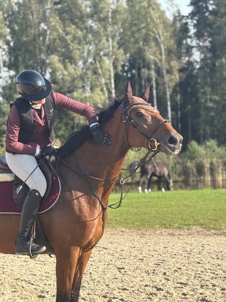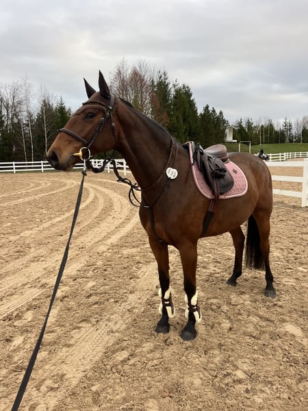 Katania is a 2020 born homebred mare that is 165 cm height. She had a foal so not been rushed into sports. She has competition experience at small classes. With a right work she can drvelop into a nice jumping horse. Though she has abilities to jumo she is easy enough for amateurs or kids. Totally safe, very reliable. Perfect for hacking and hobby riding too. Super sweet personality and very easy in all daily activities. Clear xrays, no defects or bad habits. Price 10 000 eu + VAT Located in Lithuania, helping to organize paperwork and transport.