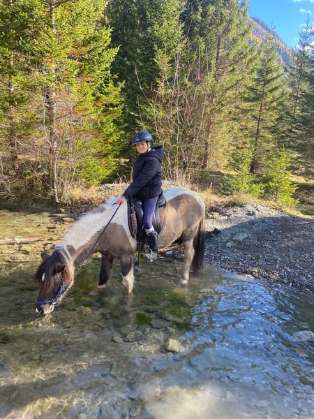 Tjörvi de Tröð IS2015180628 Hongre, 14.0 hh Mâle pie bleu avec un œil bleu Trotteur à quatre allures En Autriche depuis 2019 Exempt d’eczéma, ferré, vermifugé, à jour de ses vaccinations Ce cheval exceptionnellement beau séduit non seulement par sa couleur rare, mais aussi par ses allures, sa tranquillité et son caractère équilibré et amical. Il est poli avec les humains et les autres chevaux, curieux, intrépide et très sociable – un vrai charmeur. La circulation routière, le transport en van, le maréchand, les chiens, les poussettes, les tracteurs et les vélos ne lui posent aucun problème. Ce que nous souhaitons pour lui : Box en paddock avec compagnie Il ne supporte pas la vie en intérieur à cause de ses poumons Prix avec équipement, négociable : 12 500 € L’équipement est en excellent état : - Bride de randonnée de Flottur - Selle adaptée de la marque Eques avec couverture, girth et étriers Prix sans équipement : 11 000 € N’hésitez pas à me contacter si vous souhaitez le rencontrer. Il se trouve dans le magnifique Lungau, au Kirchnerhof. 0664/1225261