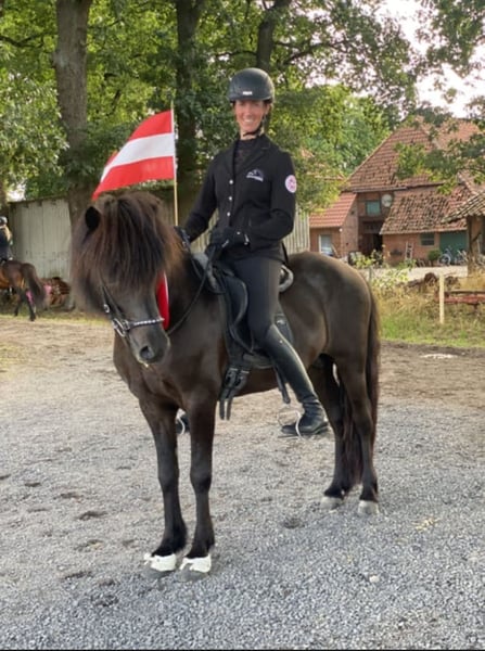 Frakkur fra Gavnholt Wallach, 1,42m groß Rappe ohne Abzeichen Fünfgänger gesund, ekzemfrei, beschlagen, entwurmt sehr gut ausgebildet Sport A qualifiziert F1 T2 kann alle Passdisziplinen abdecken Teilnehmer und Finalist auf der MEM 2022 in F2 und T4 V: Muni frá Kvistum 8,17 (Ext 7,94 Re 8,31)‼️ VV: Aron frá Strandarhöfði 8,54 (Ext 8,22 Re 8,75)‼️ M: Frökk frá Grenstanga 7,83 (Ext 8,09 Re 7,66) MV: Kormákur frá Kjarnholtum 8,02 (Ext 8,4 Re 7,64) 9,0 für Pass‼️ Nicht jeden Tag hat man die Gelegenheit ein Pferd wie Frakkur kaufen zu können. Frakkur ist TOP ausgebildet. Er kann wirklich alles. Da wir sehr viel Wert auf klassische Dressur legen, ist er auch hier bestens ausgebildet und würde auch in den Dressuraufgaben eine sehr gute Figur machen. Er ist für Österreich 2022 auf den Mitteleuropäischen Meisterschaften in der F2 und der T4 an den Start gegangen und konnte sich direkt für beide A-Finals qualifizieren. Frakkur ist der perfekte Lehrmeister für die Jugend, er ist Turniererfahren und ist die perfekte Kombination aus Spaß- und Sportpferd. Unter der Woche am langen Zügel durch den Wald tölten und am Wochenende im Rennpass über die Ovalbahn fliegen. Pass ist so einfach zu reiten, dass er es weniger erfahrenen Passreitern ohne mit dem Ohr zu zucken einfach beibringt. Turniereinstieg, Trainerprüfungen, Luxusfreizeitpferd.... er ist wirklich ALL IN ONE. Er lässt sich allein und in der Gruppe im Gelände reiten und hat keinerlei Probleme in neuen Umgebungen. Wer Frakkur kennenlernen und probieren möchte, kann dies gerne bei uns in A-5221 Lochen am See tun.