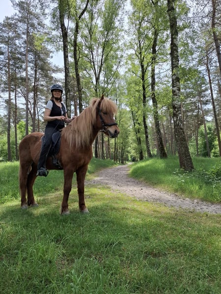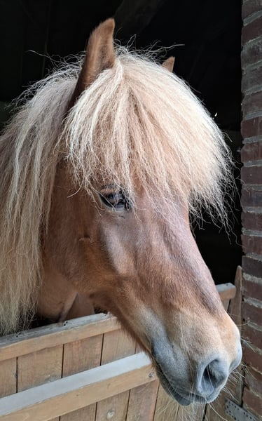 Te koop staat hier een 10-jarige, 1,43 m grote, stabiele en knappe vosmerrie (zonder aftekeningen) Gauti fra Langhusum, met heel veel manen 😀 Gauti is zeer nerveus, 100% betrouwbaar voor in de trailer, op de bak en buitenritten, en heeft bovendien heel comfortabele gangen. Zijn stap is ruim en krachtig, gevolgd door een rustige, lage-tölt, een zachte draf en alles afgerond met een lichte hand voor een prettig rijgevoel. De galop is iets gelopen en kan nog verbeterd worden. Door te uitademen, kan Gauti gemakkelijk afgeremd worden... over het algemeen moet hij vooral gemotiveerd worden, maar hij is zeer meewerkend. Zijn kracht ligt vooral bij buitenritten. Longeren, grondwerk en trailhindernissen zoals een opstap, brug en stangenwerk doet hij kalm en ontspannen. Net zo makkelijk is hij als een vrolijk en perfect handpaard. Hij laat zich graag knuffelen en blijft daarbij rustig staan. Bij ons staat hij probleemloos samen met hengsten en merries in de groepsstal. Tijdens het voeren is hij makkelijk in de omgang; 24 uur weidegang vind ik over het algemeen te veel en zou ik voor Gauti niet aanraden. Ik wens voor Gauti een recreatieve ruiter die hem afwisselend bezig houdt en graag buiten rijdt. Ik heb Gauti op hoefbeslag gezet, in het terrein draagt hij hoefbeschermers. Gauti is gevaccineerd, ontwormd, eczeemvrij en heeft een recente RX met röntgenfoto’s (alles in orde). Zijn tanden zijn in maart 2025 verzorgd en in december 2025 is hij osteopathisch behandeld. Een passende zadel van Eques, samen met andere accessoires, kan eventueel mee worden gekocht. Gauti kan bij ons in de binnenbak of buitenritten uitgebreid getest en leren kennen worden. Voor verdere vragen ben ik graag telefonisch bereikbaar: mobiel 0152/54385267