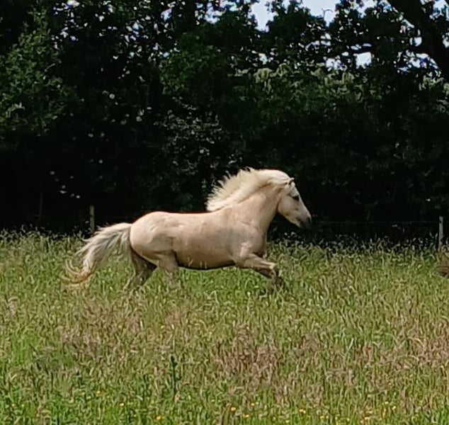 Mit 4 1/2 bis 5 Gängen, einem schön geformten Hals , mit viel Mähne und Charme ausgestattet + der aussergewöhnlichen Farbe "Isabellwindfarben" bezaubert er jeden Besucher.