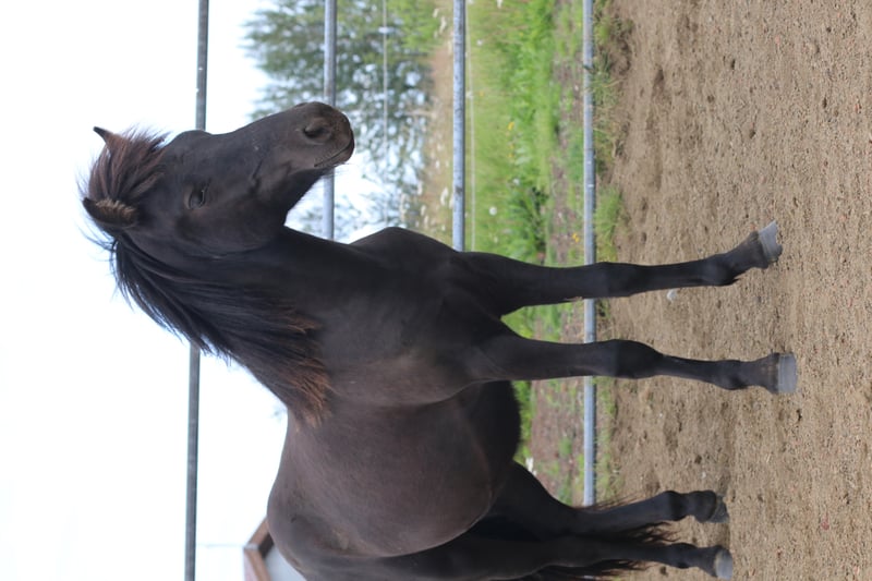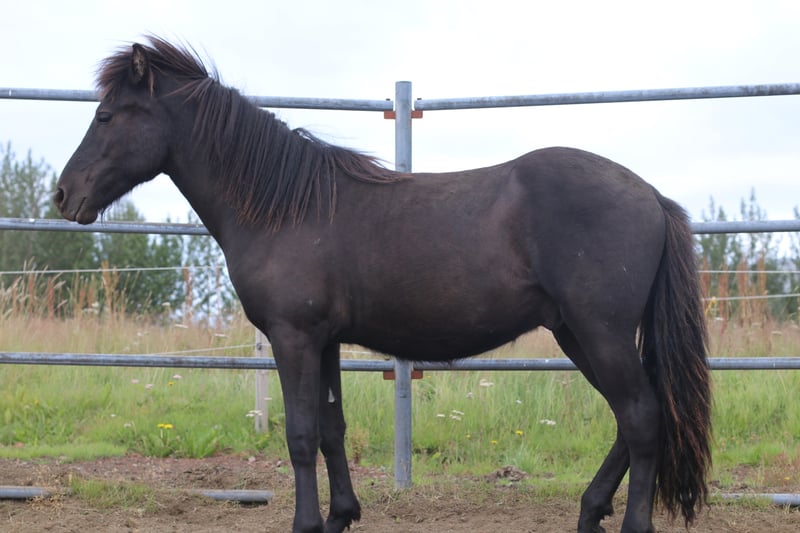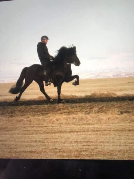 Den här unge hingsten har sin framtid ljus. Han är söt och kurioskaraktör och hans kropp och nacke är välbyggda. Han går främst på tölt när han springer ut ensam. De två sista bilderna är av hans far och hans partitur.