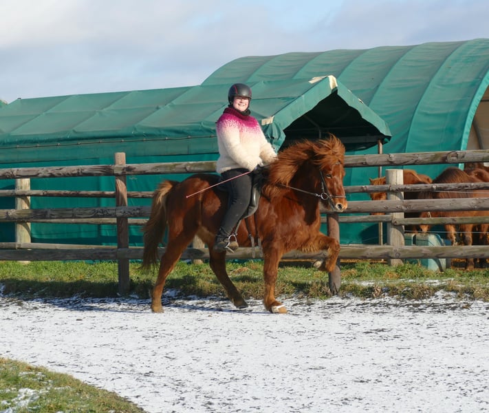 Red Diamond Neisti is a promising young Icelandic gelding who already demonstrates impressive potential through his age-appropriate, professional training. As an elegant four-gait horse, he impresses with light-footed, rhythmical movements and a particularly beautiful, balanced canter—easily and effortlessly responsive, even on small circles. He is familiar with groundwork, lunging, and riding both indoors and outdoors. Neisti has already experienced a variety of situations and works with focus and reliability. He is sensitive to aids, offering his rider a refined, harmonious riding experience. Thanks to his good rideability and natural willingness to perform, he is suitable both as a talented competition horse and as an uncomplicated, motivated partner for leisure riding. He is well-behaved in handling, well-socialized within our gelding herd, and relaxed when being trimmed by the farrier. A young gelding with a bright future—attentive, elegant, and ready for new challenges. Neisti is looking for a person who wants to further develop his potential and grow together with him. Currently, he is suitable for a confident, relaxed teenager or an ambitious adult—not an absolute beginner’s horse, but also not particularly demanding.