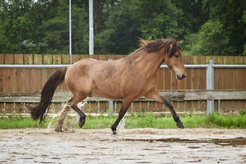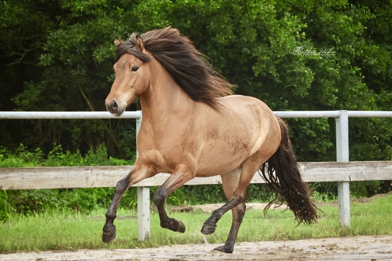 Mímir van Hellubrún *2019 in Duitsland 1,43m V: Lukkuriddari frá Pétursbergi VV: Lukku-Láki frá Stóra-Vatnsskarði (8.60) M: Friða VM: Leistur vom Habichtswald (8.33) Mimir is een vriendelijke jonge ruin die zich momenteel in de basisopleiding bevindt. Hij wordt zorgvuldig en veelzijdig opgeleid. Mimir kent grondwerk, loopt goed als handpaard en gaat al veilig in gezelschap het terrein in. Hier toont hij zich moedig met veel tölt. Hij is daarbij eerder ontspannen, altijd coöperatief en gaat alles zelfverzekerd aan. Mimir is vijf-gängig ingesteld met veel tölt- en passveranlagung, maar kan ook goed en energiek draven. De galop is momenteel nog niet ontwikkeld. Hij reageert fijn op de ruiterhulpen en doet altijd zijn best om alles goed te doen. Bij onbekende mensen kan Mimir in het begin wat sceptisch zijn in de omgang. Wanneer hij zijn mensen kent, is hij echter altijd zeer aanhankelijk. Ook zijn moeder was al bij mij in opleiding. Zij toonde zich altijd fijn, coöperatief en getalenteerd met veel gangvermogen. Vanwege zijn opleidingsniveau is Mimir (nog) niet geschikt voor onervaren ruiters. Met verdere opleiding zal Mimir zeker een geweldige betrouwbare eindeloze töltpaard worden met een mooie uitstraling. Prijs categorie B: 5.000 - 10.000€ Van particulier Locatie 29614 Soltau Vanwege de toegenomen ruitertoerisme en om dit de paarden te besparen, reken ik een vast bedrag van 40€ per afspraak. Dit wordt natuurlijk bij aankoop terugbetaald.