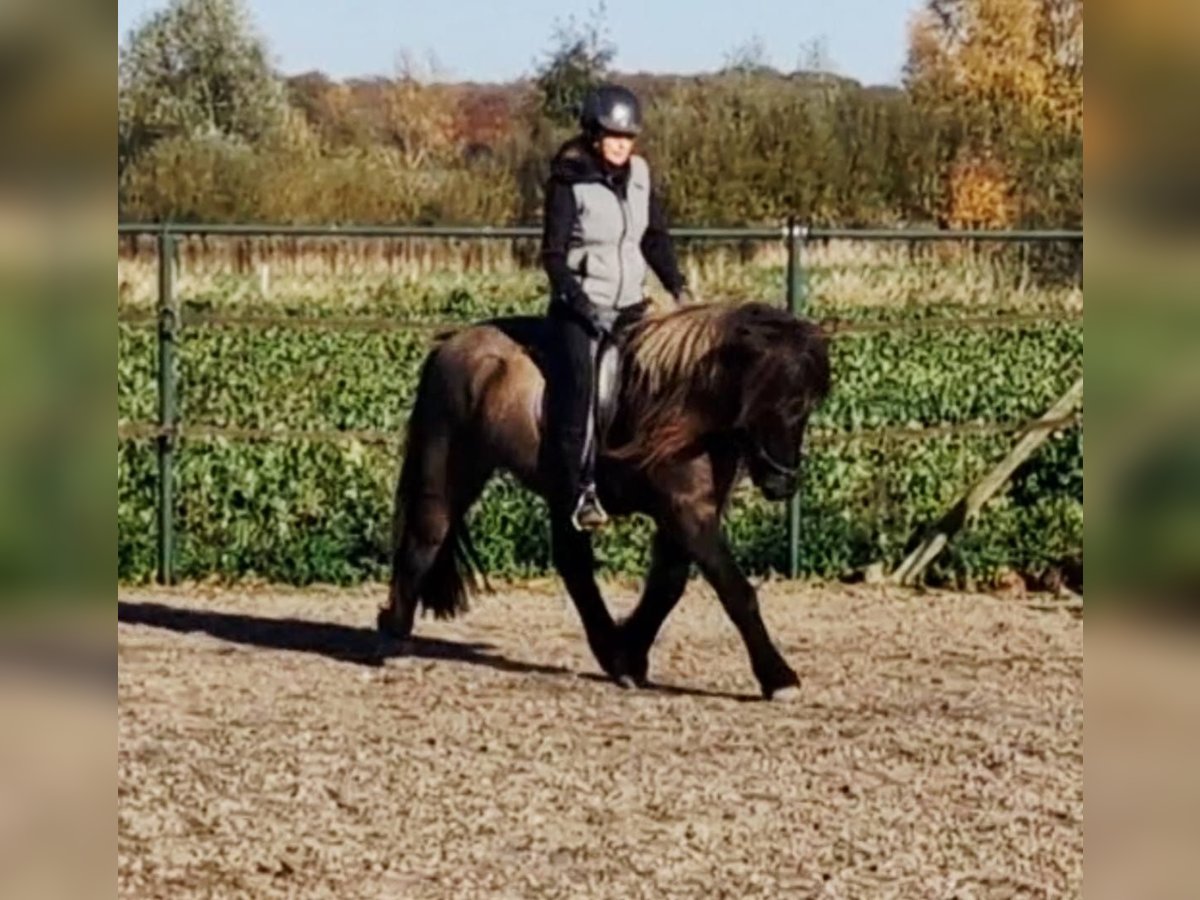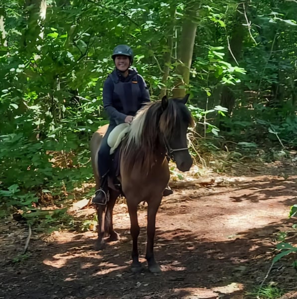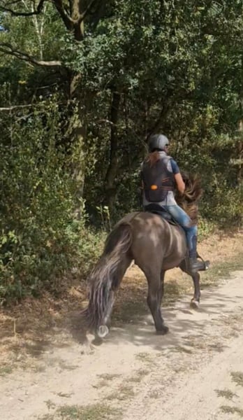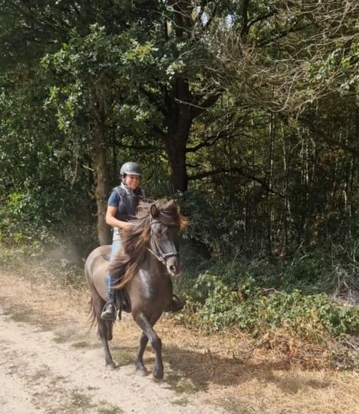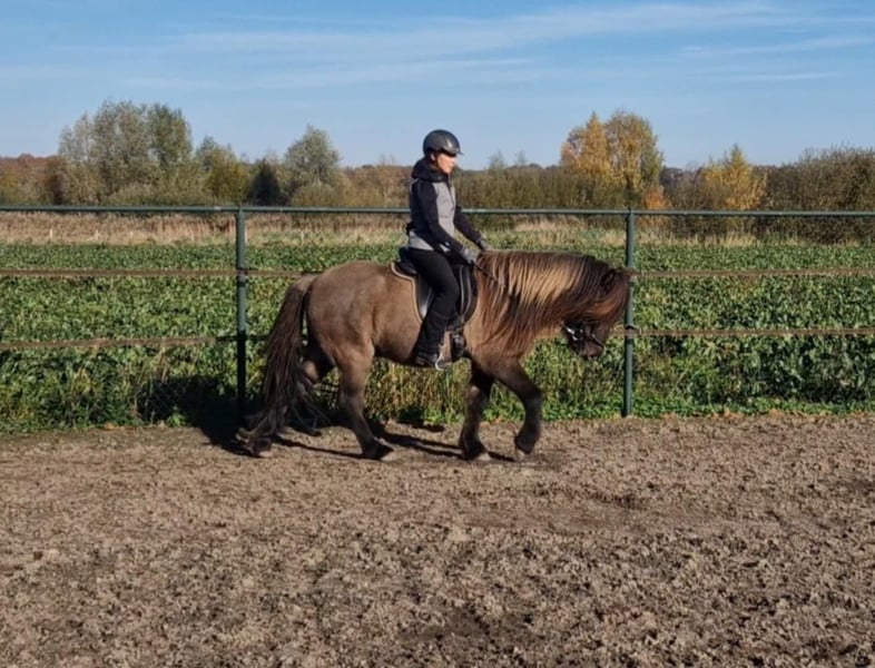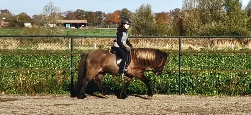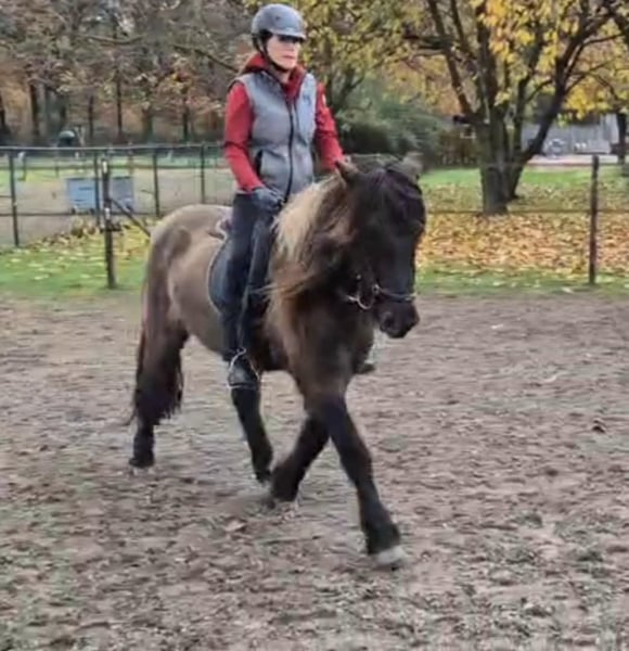 Schicker Mausfalbe, 6 J. Wallach, von 1st. Preis Eltern(Draumur fra Gulbaek x Nunna fra Gulbaek). Anfang 2025 professionell auf Bahn angeritten in DK (Trainer Kronholt) einige Monate und dort auch abwechselend mal im Gelände geritten, bietet er immer taktklarer Tölt an. Wird jetz hier auch auf dem Reitplatz brav schonend im Schritt, Trab und Tölt geritten. Auf dem Reitplatz geritten wünschen wir uns für ihm jemanden der weiss was geraderichten ist, dann ist er auf zwei Finger losgelassen zu reiten. Auf dem Reitplazt ist der Galop noch zu gelaufen und wird dort noch nicht trainiert. Der Galop ist aber im Gelände aber schon sehr schön und einfach zu reiten, auch bequem in mehrere Tempo. Bietet im Gelände immer sofort taktklar tölt an, auch mit losen Zügel.. Hatt dort etwas mehr vorwärtsdrang und ist aufmerksam. Auch wenn noch wenig Erfahrung, macht er aber kein blödsinn wie bocken, durchgehen oder steigen. Wir sind hier schon einiges auf die Straße begegnet, da hier schon Monate viel arbeiten mit große Maschinen und Lärm sind, was er allem ohne Problem gemeistert hatt. Kennt (Groß)verkehr von Lohnarbeiter hier, Fahrräder, Hunde u.s.w. Ein Pferd, gerne auch für jemanden der auch im Gelände unterwegs sein möchte....geht einfach alleine vom Haus weg. Kann mit andere Pferde an jeder Stelle im Gelände geritten werden, lauft aber auch gerne vorne. Wieder wegreiten von andere Pferden ohne Probleme. Verträglich in der Herde, spielt gerne mit unser Jährling, und ist weiterhin sehr lieb und ruhig im Umgang, Schmied, putzen, satteln usw. Wird hier in Offenstalhaltung gehalten, offfener Stall mit Wiese und Paddock. Er läuft seit ein halbes Jahr barhuf, das klappt wunderbar auf jeden Boden, die Bewegung ist aber ohne Eisen auch flacher jetz. Der Tölt ist super angenehm und bequem, wie auch Galop. Trabt sehr schön und wechselt einfach die Gänge. Supernettes junges Pferd was auch von unerfahrene Reiter brav geritten werden kann auf dem Platz und Gelände, aber gut auf leichte Hilfen reagiert und am schönsten zu reiten ist von schon etwas erfahrene Reiter mit sanfte Hand und deswegen haben wir entschlossen ihm nicht zu verkaufen an Anfänger, Wiedereinsteiger, Angsthasen oder für Familien mit Kinder. Kein Ekzem, keine Allergie oder sontiges. Er hatte beim Ankauf in 2025 vor dem Import aus DK eine ausführliche AKU inkl. 22 Röntgen Beine und ist damit in die Krankenversicherung aufgenommen, welche bei Bedarf übernommen werden könnte. Ein neue AKU darf natürlich durchgeführt werden von einem TA, der sich mit Gangpferde auskennt. Spricht dir dieses nettes und liebes Pferd an, das ich leider schweren Herzens aus eigene zunehmende gesündliche Probleme verkaufe da ich zu wenig reiten kann, dann schreib uns gerne an mit einiges an Info. Wir können dan gerne telefonieren und dir dann mehrere Videos senden, so wohl vom Platz als Gelände. Zubehör kann mit verkauft werden.