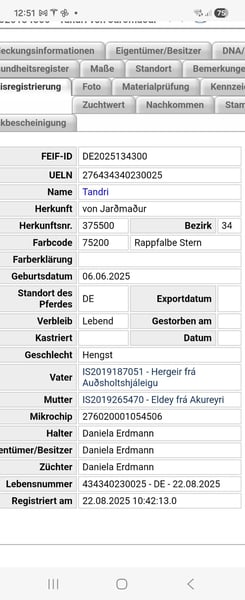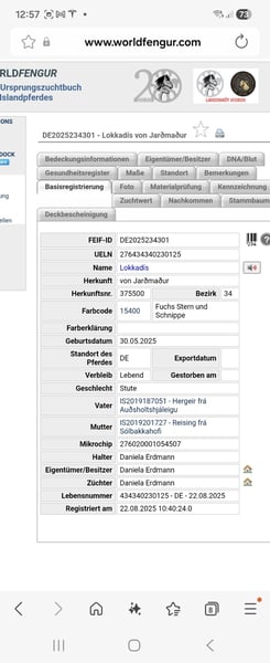 Dein Frühling-Herz-Projekt startet jetzt! Zwei wunderschöne Fohlen (geboren 2025) aus kleiner liebevollen Familenzucht suchen ein tolles Zuhause. Aktuell stehen sie noch bei ihren Müttern und befinden sich gerade in der schonenden Absetzphase- sobald diese abgeschlossen ist, würden sie sich freuen in ihre neue Familie ziehen zu dürfen. Tandri von Jardmadur (Hengst) Rappfalbe mit Stern Geb. am 06.06.2025 Blub 113 Mutter: Eldey fra Akureyri Vater: Hergeir fra Auðsholtshjàleigu Lokkadis von Jardmadur (Stute) Fuchs mit Stern und Schnippe Geb. am 30.05.25 Blub 115 Mutter: Reising fra Sōlbakkahofi Vater: Hergeir fra Auðsholtshjàleigu Die beiden kleinen Abenteurer stammen ab von Hergeir fra Auðsholtshjàleigu, der mit 8,42 (2024) FIZO geprüft wurde. Durch die sehr gute und spannende Abstammung könnte ich sie mir gut als Luxusreitpferd, zukünftiges Turnierpferd oder als Verstärkung für die qualitätsvolle Zucht von Islandpferden vorstellen. Sie verfügen beide über einen tollen Charakter, sind sehr sozial und dem Menschen gegenüber immer positiv zugewandt. Gentechnisch sehe ich sie aktuell klar fünfgängig und sie werden ca 140cm + groß werden. Beide genießen aktuell den vollen Zimmerservice mit Entwurmung, Vorstellung beim Schmied und Mineralversorgung. Abstammung in den Kommentaren Wenn ihr ein Kennenlernen vereinbaren oder nähere Informationen bekommen möchtet, meldet euch gerne per PN