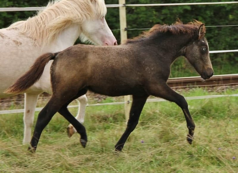 Are you looking for a stallion with that "wow" effect? A sensitive horse with a touch more temperament? Velvakandi was born in 2018 and has been with me ever since. He is free of eczema, regularly dewormed, vaccinated, and his hooves are well-maintained. Due to an injury during a mare cover, his use as a riding horse may be limited, so he is being offered at a favorable price to a permanent, caring home. He is to be sold exclusively as a breeding stallion. He is handled with the experience typical of a young horse and is also accustomed to hoof care and loading. Due to time constraints, he has not yet been backed, but he is now at the perfect age to start. He is not a horse for a quick ride but should be ridden and trained patiently, with time, to develop into a reliable and enjoyable partner. Due to his injury, he will likely only be suitable for leisure riding. His somewhat sensitive, honest, friendly, and well-behaved character, combined with a high-spirited temperament that is easy to handle, makes him lively and eager to work. In free movement, he responds immediately to light aids without becoming headstrong. Velvakandi has a refined, noble head with a well-set, slightly tapering neck and a gently curved neck-back line. Standing at about 137 cm, and with his rather sporty build, he will suit an average adult rider well. He is sturdily built, with a not-too-long back and good leg quality. As a foal, he was tested with a score of 7.9 (Ext.), 8.2 (Int.), and 8.0 (Gait). He is a well-structured stallion foal with balanced Tölt and trot, displaying medium-high movements and plenty of pace. As a five-gaited horse, he has strong, well-developed basic gaits with ample space, impulsion, and tempo, combined with beautiful movement. His Tölt is consistently visible, especially in transitions, and abundant. Even as a foal and young horse, he has demonstrated his potential in Tölt repeatedly, including some very fast Tölt. As a foal, he also showed occasional Pass and Rennpass, although I haven't seen these recently. In recent years, he has been used for breeding at my place. For organizational reasons, he is registered with Hb 2. His offspring impress with their friendly, eager-to-learn, cooperative, and uncomplicated character. They are not sensitive and are mostly balanced, with some exhibiting a lively temperament depending on the mare. Most are five-gaited, with consistently good basic gaits and plenty of natural Tölt. Photos of some offspring are included in the listing. Velvakandi’s own color genetics allow for a high likelihood of inheriting color traits. He is a dark bay with splash markings and two blue eyes. His genetic code is largely tested as AaEeTotoN/SW1 D. This means his foals can inherit all basic coat colors with a 50% chance for Tobiano, Splash, or Buckskin. His sire, Fokus vom Vindstadir, is sired by Bekan fra Kolsholti, a Fizo-licensed Sport A stallion, descending from elite stallions Faldur frá Syðri-Gróf 1, Oddur frá Selfossi, and Austri frá Austurkoti. Fokus’s dam, Flugsael vom Vindstadir, is also Fizo-licensed, with her sire being Skarði vom Vindstadir, an elite Fizo, World Champion, and Sport A stallion. His dam, Cassiopeia, is a strong-moving, character-wise brave mare from the Stutbuch 1, with lineage including Djarfur frá Lukkubæ (Fizo-licensed, German champion and World Cup participant), Hjalmar frá Vatnsleysu, Sveinn-Hervar frá Þúfu í Landeyjum, and others. Velvakandi can be personally visited, and a small number of his offspring are also available for viewing on-site. The buyer is welcome to have an AKU (equine health certificate) performed. Transport can be arranged at the buyer’s expense.