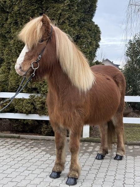 Lotning frá Miðsitju Mare, 1.39 m groß Fuchs mit Blesse und viel Langhaar viergängig geritten *2014 auf IS registriert AKU vorhanden inklusive Röntgenaufnahmen ✅ beschlagen, entwurmt ✅ V: Blær frá Miðsitju 8,64 (Ext 8,29 / Re 8,87)‼️ VV: Arður frá Brautarholti 8,49 (Ext 8,34 / Re 8,60)‼️ M: Lísa frá Kjartansstödum 8,16 (Ext 7,89 / Re 8,35)‼️ MV: Kjarval frá Sauðarkróki 8,32 (Ext 7,94 / Re 8,70)‼️ Lotning ist optisch ein echtes Püppchen. Deshalb trägt sie bei uns auch den Spitznamen „Püppi“. Im Umgang und in der Herde zeigt sie sich jedoch keineswegs zierlich – sie ist in allem äußerst unkompliziert. Ihre Abstammung liest sich für Kenner wie ein Bilderbuch! Eine Tochter des außergewöhnlichen Blær frá Miðsitju, mit durchgehend geprüfter Ahnentafel, in der zahlreiche Einzelnoten von 9,5 und 9 bei den Reiteigenschaften zu finden sind. Das macht sie auch für die Zucht äußerst interessant. Unter dem Sattel zeigt die schöne Stute ein sehr angenehmes Temperament, mit vier klar abgegrenzten Gangarten und großem Willen, mit dem Reiter zu arbeiten. Sie ist sehr gut ausgebildet und besticht durch ihren ausgeglichenen Charakter, den alle Nachkommen von Blær mitbringen. Sie wird dem zukünftigen Besitzer viel Freude bereiten – ganz gleich, in welchem Bereich. Ob als tolles Freizeitpferd, Partner für den Einstieg in den Sport oder als Zuchtstute mit Top-Ahnentafel: Lotning ist das Allround-Paket. Aufgrund ihrer unerschrockenen, ruhigen Art eignet sie sich auch bestens für weniger erfahrene Reiter, Jugendliche oder Kinder. In neuer Umgebung und bei neuen Situationen zeigt sie sich absolut unbeeindruckt und überzeugt durch ihre Souveränität. Sie ist ein 100%iges Spaßpferd für die ganze Familie oder den ambitionierten Freizeitreiter. Ihre Gänge sind deutlich abgegrenzt, Tölt leicht zu reiten und sehr bequem im Sitz. Sie ist gut ausgebildet und bringt mit ihren 12 Jahren viel Erfahrung als Reitpferd mit. Wer die schöne Lotning kennenlernen und testen möchte, kann dies nach Absprache gerne bei uns in A-5221 Lochen am See tun.