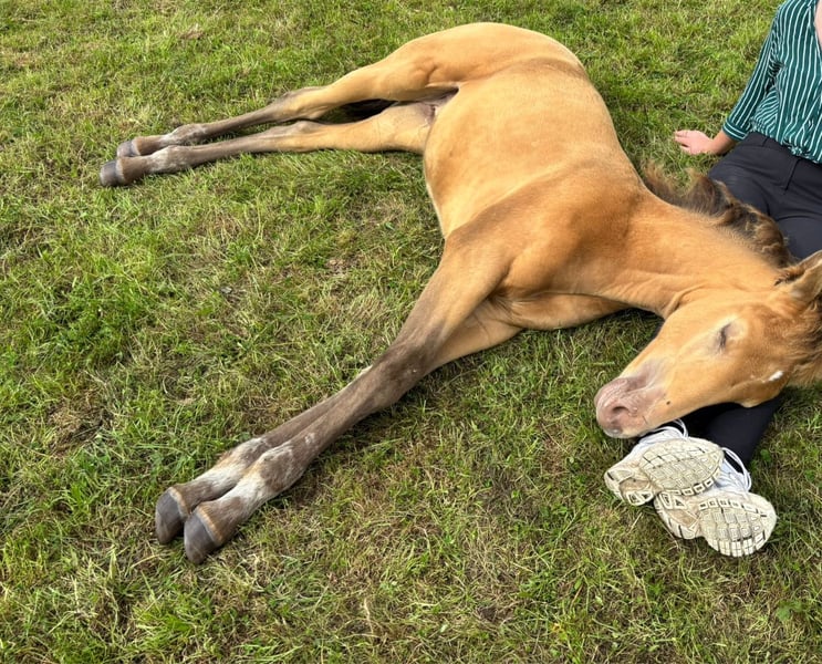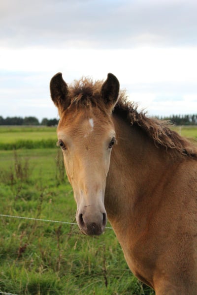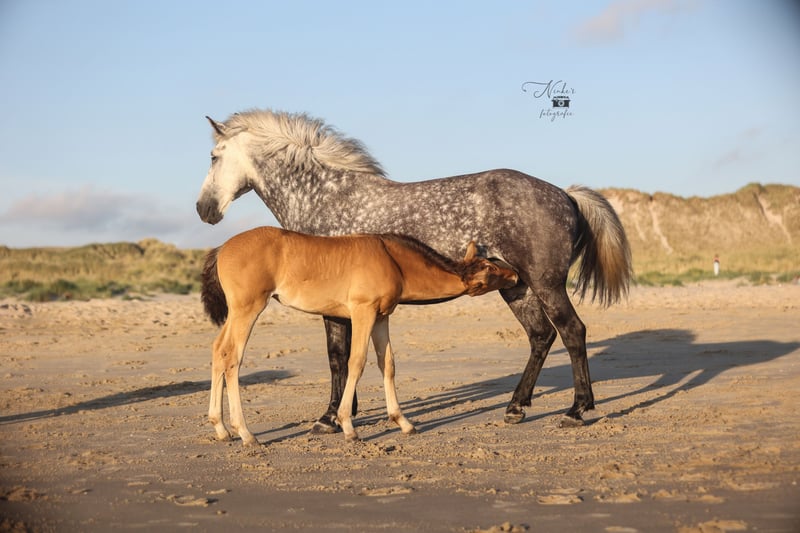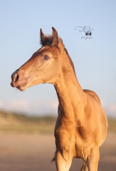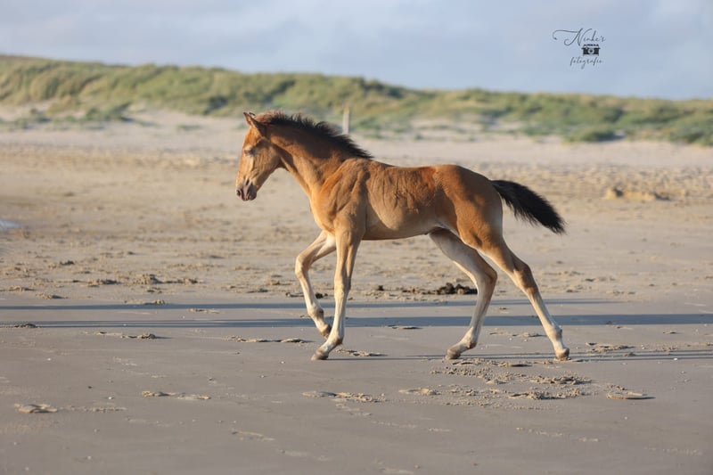 For sale: Beautiful filly Born on 30-05-25 She has a stunning amber champagne color and is expected to grow into a large mare just like her mother. She is being raised alongside her mother in a stable herd of various ages. This provides a nice and social foundation for the future. Pedigree: - Mother: Zep's Pixel van de Woodystables crossbreed Groninger horse x Icelandic – bombproof, strong, friendly, and versatile. Height 1.58 m. - Father: El Perrier van ‘t Pietershof - Perry 43.75% Arabian blood, and on the mother's side comes from a special gaited horse cross (Rocky Mountain x Paso). Height 1.52 m. Recently microchipped and registered with the EASP studbook. Characteristics: Healthy and curious character, very friendly. Beautiful build with strong legs. Unique color for enthusiasts. She is already used to many things such as forest and beach, picking up her feet, grooming, and walks nicely on a lead. Has already been on the trailer a few times with her mother. Possibility to test for DMRT3 (gaited). Location: Schoorl (nh) Price: upon request Feel free to come and meet this special foal. A great opportunity for anyone looking for a striking and sweet companion! Extra option: Currently, she is still staying with her mother, but she can be reserved with a deposit. Please message for more information or to arrange a viewing. Price negotiable, good home important.