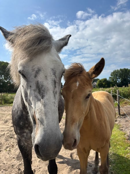 Zu verkaufen: Wunderschönes Stutfohlen Geboren am 30.05.25 Sie hat eine wunderschöne amber-champagnerfarbene Fellfarbe und wird voraussichtlich zu einer großen Stute heranwachsen, genau wie ihre Mutter. Sie wächst an der Seite ihrer Mutter in einer stabilen Herde mit verschiedenen Altersgruppen auf. Dies schafft eine gute und soziale Grundlage für die Zukunft. Abstammung: -Mutter: Zep's Pixel von den Woodystables Kreuzung Groninger Pferd x Isländer – bombensicher, stark, freundlich und vielseitig. Stockmaß 1,58 m. -Vater: El Perrier von ‘t Pietershof - Perry 43,75 % Arabisches Blut und stammt mütterlicherseits aus einer besonderen Gangpferdekreuzung (Rocky Mountain x Paso). Stockmaß 1,52 m. Kürzlich gechipt und im EASP-Zuchtbuch eingetragen. Merkmale: Gesundes und neugieriges Wesen, sehr freundlich. Schöne Statur mit starken Beinen. Besonders schöne Farbe für Liebhaber. Sie ist bereits an viele Dinge gewöhnt, wie Wald und Strand, Hufe geben, Putzen und läuft brav mit. War schon mehrmals mit ihrer Mutter im Anhänger. Möglichkeit zur Untersuchung auf DMRT3 (Gänge). Standort: Schoorl (nh) Preis: auf Anfrage Kommen Sie gerne vorbei, um dieses besondere Fohlen kennenzulernen. Eine einmalige Gelegenheit für diejenigen, die auf der Suche nach einem auffälligen und lieben Partner sind! Zusätzliche Möglichkeit: Momentan bleibt sie noch bei ihrer Mutter, kann aber gegen Anzahlung reserviert werden. Bitte melden Sie sich für weitere Informationen oder Besichtigungen. Preis nach Vereinbarung, ein gutes Zuhause ist wichtig.