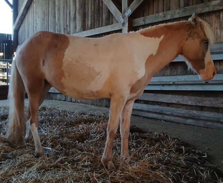 Ich gebe meine Braunfalbwindfarbscheckstute aus 2023 in geeignete Hände bevorzugt in Maritime Nähe zu günstigem Preis ab. Leider hat sie sich dieses Jahr angefangen zu Scheuern und sucht daher einen anderen Platz entweder Mückenärmer oder wo man mehr Zeit für ihre aufwändigere Pflege hat. Aktuell ist noch nicht ersichtlich ob es nur ein wachstumsbedingter Mangel, oder eine Stressbedingte Reaktion ist oder Dauerhaft bleibt. Aktuell wird sie nach einer Kur zur Stärkung des Immunsystem vom TA weiter behandelt. Eltern und Großeltern wie auch Halbgeschwister sind Ekzemfrei, daher nicht ersichtlich warum und woher. Sie sollte dennoch nicht für Zuchtzwecke genutzt werden. Mit Ekzemdecke stand sie relativ Symptomfrei, diese kann mitgegeben werden. Sie ist mit ihren zwei Jahren aktuell mindestens 135 Stm und gut entwickelt, natürlich noch nicht ausgewachsen. Vom Charakter total freundlich durchgechillt das potentielle spätere absolut brave Familien -Freizeitverlasspferd mit Option auf Kurse, Waderritte und mehr. Zeigt Freilaufend klare sicher vorhandene Grundgänge mit viel Raumgriff und guten Bewegungen. Tölt ist im Übergang manchmal zu sehen und mit guter Veranlagung vorhanden. Sie hat volle Papiere und ihre Extravagante Farbe ist via Gentest bestätigt. Sie ist ansonsten gesund und unauffällig , wird von Geburt an regelmäßig entwurmt, Hufgepflegt, ist gegen Tet. und Infl. geimpft und steht 24/7 auf Futter mit Mineralversorgung. Jungpferdemäßig gehändelt ist sie absolut brav im Umgang und ist auch Hufpflege - sowie Verladefromm. Festpreis Bei echtem Interesse kann sie gerne angeschaut und Kennengelernt werden, die Fotos sind von diesem Jahr, die letzten sind die aktuellsten, die Mähne wurde kurz geschnitten da sie total zerrupft war. Verkauf nur innerhalb EU.