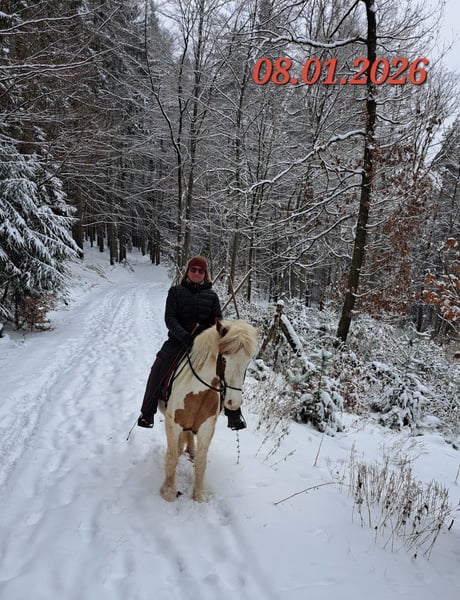 Gloría vom Holtdorftal ist eine knapp 5 jährige Isistute und momentan 1, 41 m groß. Sie kam im September 2024 mit einer weiteren Zuchtstute direkt vom Züchter zu mir. Sie war tragend für 2025. Sie ist dort auf großer Fläche im Herdenverband aufgewachsen und war nur halfterführig. Ich begann mit Ruhe die Jungpferdeausbildung und die Basisausbildung. Sie bekam am 14.05.2025 ein sehr großes, gut gebautes Hengstfohlen. Die Geburt hat sie ganz toll gemacht und man durfte auch von Anfang an an ihr Fohlen. Januar 2026 wurde das Fohlen abgesetzt, hat sie super souverän gemeistert. Sie wurde schonend von mir im Sommer 2025 gebisslos angeritten. Sie kennt in der Bodenarbeit die Arbeit am Kappzaum, an der Wassertrense, Longenarbeit, Equikinetik, Stangenarbeit. Sie kann am Kappzaum sowie an der Trense Schenkelweichen, Schulterherein. Travers sind wir langsam am beginnen. Kleine Zirkustricks machen ihr super viel Spaß. Freiarbeit macht sie gut und sehr fein. Unter dem Sattel geht sie super entspannt ins Gelände, auch wenn ihr Fohlen zuhause geblieben ist. Stute und Fohlen konnte man immer zum Arbeiten toll voneinander trennen. Wir gehen überwiegend alleine ins Gelände in allen Gangarten. In der Gruppe kann sie sehr gut hinten bleiben und lässt sich stets durch einen Pfiff anhalten auch wenn andere Pferde weiter galoppieren. Sie geht unter Flatterband durch, über Planen. Große Arbeitsmaschienen, Autos, Hunde, Wanderer war bis jetzt alles kein Problem. Unser Reitplatz ist sehr klein, da geht sie Schritt und Trab Bahnfiguren und Anfänge vom Seitwärts. Sie hat ganz tolle bequeme und flüssige Gangarten. Ich lege großen Wert auf eine korrekte klassische Ausbildung. Sie hat einen schönen raumgreifenden Trab mit schöner Halsung. Der Galopp hat eine schöne Aufwärtstendenz. Bei mehr Kraftzuwachs wird man diesen schön versammeln können. Der Schritt ist fleißig, aber nicht über Tempo und keine Passverschiebung. Auf der Wiese und unter dem Sattel kann sie schon schöne Strecken im Tölt halten. Sie steht bei mir im Winter in einem Offenstall mit Wiese und 24h Zugang zu Heu. Im Sommer 24 h auf großen Wiesen. Sie ist absolut freundlich zu allen Pferden egal ob in der Herde oder zu fremden Pferden. Sie ist regelmäßig entwurmt, geimpft und alle 6-8 Wochen werden die Hufe bearbeitet. Sie läuft hier barfuß und das auch gut im Gelände. Bei größeren Runden hat sie vorne Schuhe an. Hinten hat sie bis jetzt keinen Schutz gebraucht. 18 12.2025 wurden die Zähne gemacht. Protokoll vorhanden, Tierärztin super zufrieden. Ich habe sie als Zuchstute im Stutbuch 2 eintragen lassen. Sie ist ein sehr sensibles, arbeitswilliges Jungpferd. Du solltest dich mit Jungpferdeausbildung auskennen oder Unterstützung haben. Bei Interesse und Fragen sehr gerne per Whats App melden, 015757999782.
