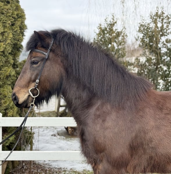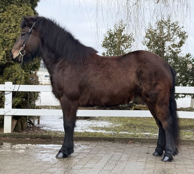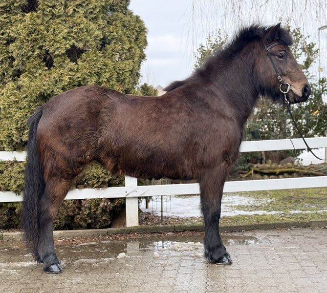 Gleði Stute, 1,41m groß *2020 in Deutschland viergängig geritten bisher Dunkelbraune ohne Abzeichen ekzemfrei, gesund, beschlagen, geimpft, entwurmt V: Myrkvi vom Kronshof 8,31 (Ext 8,27 Re 8,33)‼️ VV: Óðinn vom Habichtswald 8,79 (Ext 8,46 Re 9,02)‼️ M: Gersemi von Hagenbuch MV: Lykill frá Blesastöðum 8,30 (Ext 8,20 Re 8,36)‼️ Gleði ist eine harmonisch gebaute Stute, aus deutscher Zucht, mit einer Abstammung, die sich für Züchter wie ein Märchenbuch liest. In Ihrer Blutlinie finden sich die bekanntesten Hengste und Stuten der Islandpferdezucht. Nicht nur für die weitere Zucht macht sie das interessant. Die hohen Reiteigenschaftsnoten Ihrer Vorfahren lassen auf dem Papier schon erahnen was ein tolles Reitgefühl Gleði dem Reiter gibt. Ihre Gänge sind klar getrennt, von guter bis sehr guter Qualität und zeigen ansprechende Bewegung. Sie ist im Gelände, auf der Bahn und in der Halle gleichermaßen entspannt zu reiten, dass es eine pure Freude bereitet, dieses Pferd arbeiten zu dürfen. Ihr Charakter ist aus Gold, ihre Nerven aus Stahl und das macht sie auch für die Jugend zum perfekten Begleiter auf vier Hufen. Man könnte ein Pferd wie Gleði wohl als die "eierlegende Wollmilchsau" beschreiben, denn mit ihr stehen einfach alle Türen offen. Zucht, Sport, Freizeit, Trainerscheine und Kurse sind mit ihr möglich. Sie zeigt ein Talent für Dressurlektionen und läuft aufgrund ihres vorteilhaften Gebäudes fast von allein in Haltung. Im Umgang ist sie höflich, unkompliziert und dem Menschen sehr zugewandt. Streicheleinheiten beim Putzen findet sie klasse und genießt die Aufmerksamkeit sichtlich. Wer diese tolle Stute kennenlernen und probieren möchte, kann dies gerne bei uns in A-5221 Lochen am See tun.
