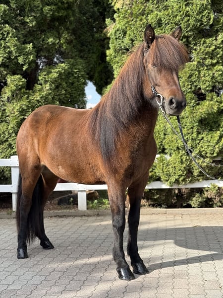 Brynja of Solhof *Born in 2020 in Austria Mare, currently 14.1 hh Brown with a lot of long hair Healthy, vaccinated, dewormed, shod ✅ Teeth done in April 2025 ✅ Currently ridden four-gaited Sire: Eldfari frá Laugaboli 7.99 (Ext 8.06, Re 7.95) Dam Sire: Borgar frá Strandarhjáleigu 8.44 (Ext 8.39, Re 8.47) ‼️ Granddam Sire: Aron frá Strandarhöfði 8.54 (Ext 8.22, Re 8.75) ‼️ Dam: Bylgja frá Höfn Maternal Granddam: Hljómur frá Horni I 8.15 (Ext 7.86, Re 8.34) ‼️ Exceptional Icelandic mare with world-class potential We are offering a highly talented mare that truly leaves nothing to be desired – neither in appearance nor in gait quality. She impresses with her striking beauty, presence, and her high-stepping, clearly articulated gait. This mare has the unmistakable potential to represent Austria in breeding and even at world championships. Her bloodlines include some of the most influential stallions of all time. Sportingly, she leaves no doubt: she has the aptitude to succeed at the highest levels of competition and consistently demonstrates elasticity, expression, and willingness to perform. Her balanced, friendly nature is especially noteworthy. This makes her not only attractive to ambitious riders but also very suitable for young riders. She provides safety and confidence without compromising on quality or performance. Sound, correctly built, and of Austrian breeding, she is an extremely valuable mare for both sport and breeding. A true exceptional horse for connoisseurs seeking top quality, future potential, and beauty in one animal. Brynja is not only an extraordinary talent but also an investment in the future of sport and breeding. She is currently in ongoing training with a focus on sport and breeding approval. She can be used immediately or further trained. If you wish to get to know and try this incredibly beautiful mare, please contact us to arrange a visit at our location in A-5221 Lochen am See.