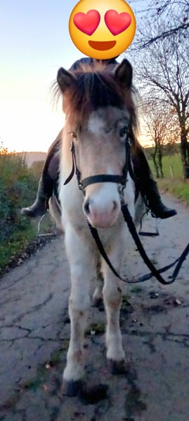Fegurdardis ist ein Schatz. Sie ist 2018 geboren , gesund, Ekzemfrei und hatte unkompliziert 2 Fohlen. Dieses Jahr wurde sie angeritten, da ich zeitweilig akuten Zeitmangel habe stand sie zwischendurch und wird aber jetzt wieder seit kurzem gearbeitet. Zurzeit wird sie alleine ins Gelände geritten. Noch Barhuf und aufgrund schlechter Wege aktuell nur in Schritt und Trab. Dabei ist sie fleißig und entspannt, reagiert sehr gut auf Stimmkommandos und hat eine gut funktionierende Bremse so das sie sich stehts leicht durchparieren lässt. Fegi ist jetzt schon relativ schreckfrei uns begegnen öfters Autos, Fahrradfahrer, Traktoren teils mit Anhänger und Fußgänger und sie ist dabei ganz gechillt. Auch mein Kind auf ihr Führen macht sie ganz brav mit und zeigt ihre jetzt schon gut vorhandene Zuverlässigkeit. Fegurdardis ist Fünfgangveranlagt mit sicher vorhandenem Schritt und Trab. Im Galopp kann man manchmal die Fünfgangveranlagung erahnen. Tölt und auch Pass wurden Freilaufend auf der Weide schon gesehen. Auch habe ich sie letztens beim Reiten angetestet bezüglich Tölt und mit wenig Hilfen konnte ich direkt die ersten Schritte Tölt abrufen, so das ich mir sicher bin dass das Eintölten ganz easy wird. Benötigt aber noch mehr Muskelaufbau und Routine bevor man mit dem Tölttraining beginnt. Im Umgang ist sie sehr brav und easy, steht lieb und ruhig beim Putzen und Aufzäumen und ist es gewöhnt in den Pferdeanhänger verladen und damit gefahren zu werden. Fegurdardis bringt eine gute Größe von ca. 139 Stm mit sportlichem Exterieur auf Basis eines stabilen Fundaments. Sie hat keine Probleme mich mit 75 kg abzudecken. Durch ihre Hammer Sonderfarbe ist sie auch ein echter Blickfänger fürs Auge. Als maximal Erdfarbschecke mit Stern und Schnippe und einem Braunen und Blauen Auge. Sie ist genetisch bestätigt zusätzlich Splash-carrier. Für mich ist sie ein zukünftiger verlass Allrounder für klein und groß die ich mir mit weiterer Ausbildung im Freizeit, Zucht, Kurse, Wanderritt, kleiner Sport und Therapiebereich gut vorstellen kann. Aktuell wird sie noch zu einem sehr fairen Preis abgegeben. Mit Beschlag und weiterer Ausbildung wird dieser aber entsprechend ihres Ausbildungsstandes angepasst. Bei echtem Interesse schreibt mich gerne an.