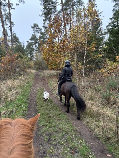 Embla is a tall, four-gaited mare with plenty of potential. She has four clearly defined gaits and demonstrates a lot of talent. Her basic gaits are easy to collect, eager, and rhythmically clear, with elegant movements. She sometimes needs a little support in her tölt, but it is now always secure and rhythmically correct. With further training, she will surely develop a very consistent tempo variation; so far, she finds slow to medium speeds easiest. Embla is a horse that always maintains a positive work attitude and approaches her tasks with lots of energy. She is very eager to learn and always wants to please. In terms of character, she is exceptionally affectionate towards people; she always approaches joyfully and loves being pampered. In the field, she is fearless and highly motivated; you can explore the woods with her for hours. She has also participated in competitions, holidays, and off-site training, always handling these situations confidently and calmly. She has been regularly checked by the dentist and osteopath. All in all, Embla is a truly interesting mare with a lot of talent and charm. I am looking for someone who enjoys working with her to help her reach her full potential. With her, you will have many wonderful rides, whether at competitions, in dressage, or out in the countryside. Due to her high energy level, she is not suitable for beginners. I am reluctantly offering her only to the right home, as I value her highly—place matters more than price here. Further pictures and videos are available upon request.