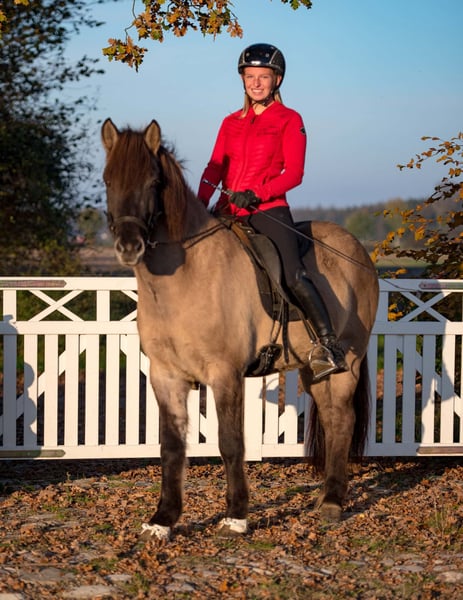 Opis: Olbrzymia, elegancka klacz sportowa pięciobiegowa o doskonałym galopie wyścigowym oraz spokojnym i opanowanym charakterze. Wygląd zewnętrzny: Gát ma wyjątkowo dobrze zbudowaną sylwetkę o długich liniach. Jest ogromna i bardzo wyrazista. Charakter: Ma bardzo przyjazny charakter. Jest zawsze otwarta na kontakt z ludźmi i innymi końmi. Nowe sytuacje przyjmuje z otwartością i jest bardzo odważna. Chody: Gát posiada doskonały galop wyścigowy, który jest dostępny dla każdego jeźdźca na każdym etapie życia. Dodatkowo ma wyjątkowo dobry i łatwy do jazdy kłus. W stępie jest pewna, elastyczna i reaguje na miękką wodzę. Tölt można jeździć w każdym tempie, zarówno z, jak i bez uzdy. Poziom wyszkolenia: Gát ukończyła podstawowe szkolenie. Potrafi wykonywać odstawanie od nóg, cofanie, skręt w miejscu i shoulder-in. Jest dobrze wyszkolona w podstawowych chodach na ujeżdżalni i potrafi jeździć we wszystkich chodach na wodzy. W tölt osiąga różne prędkości, od spokojnych do wysokich, i utrzymuje tölt nawet przy przejściu na uzdę. Posiada również łatwy do jazdy galop wyścigowy na każdym poziomie. Obecnie jest w trakcie szkolenia na trudne próby, F1 i PP1. Dla kogo pasuje: Wyjątkowo dobra klacz sportowa dla każdego jeźdźca. Możemy wyobrazić ją w wysokim sporcie, gdzie może odnosić sukcesy w pięciobogu i próbach tölt. Ze względu na jej dobry charakter i spokojne usposobienie, będzie także idealna dla młodego jeźdźca, który szuka konia do rozpoczęcia startów w turniejach. Może też świetnie sprawdzić się jako koń rekreacyjny. Ze względu na jej wzrost (1,53 m) doskonale nadaje się także dla wysokiego jeźdźca. Ojciec: Ojciec Gát, Naskur von Oed, wygrał w 2007 roku klasę sześciolatków w Niemczech i zakwalifikował się na Mistrzostwa Świata. Zaledwie o sześć setnych sekundy wyprzedził zwycięzcę tej klasy hodowlanej, co zapewniło mu tytuł wice-mistrza świata w 2007 roku. Ponadto został wybrany na „Koń hodowlany roku 2007” z dużą przewagą nad konkurentami. Stan opieki: Gát, jak wszystkie konie wyhodowane w Kranichtal, jest wolna od ekzem i pochodzi z linii rodzicielskich bez ekzemu. Może być obejrzana i wypróbowana na przejażdżce próbnej w dowolnym momencie. Kategoria cenowa: D - powyżej 35 000 €