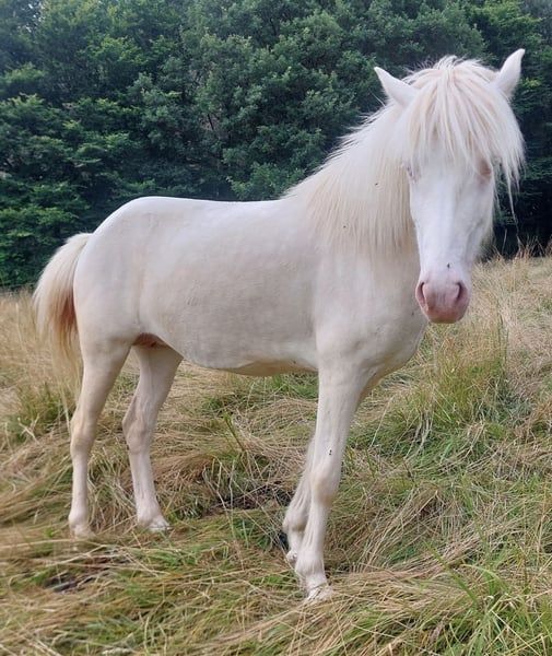 My beautiful Titania is looking for her forever home. She was born in 2016 and has so far only been used as a broodmare. Due to a foaling issue this year, she should no longer be used for breeding. She will be able to move to a new home after her last foal is weaned, which will be by early 2026. Titania is free of eczema and injuries. Unfortunately, she has a slowly progressing illness that so far does not limit her and has only been visible as a cosmetic issue during the summer. Therefore, she is being offered at a very reasonable price to the best of hands, for people who have time to work with her. Sadly, I have very little time myself, so I think it would be a shame if she just stands in the pasture next year without any activity. After weaning her foal, she could start her training as a riding horse. In terms of character, she is a sweetheart who cooperates willingly and is well-socialized within the herd, exhibiting unobtrusive behavior. Her temperament is generally balanced, with a clear mind combined with willingness and enthusiasm for movement. Her registration in the studbook demonstrated her great potential in the basic gaits, as she often transitions effortlessly from a fast trot into a lively tölt, confirming her strong tölt aptitude. I believe that, like her mother, she will likely develop her tölt naturally under saddle, especially on downhill stretches. Although she has not shown her tölt in free movement so far, I am confident that this trait is present. This also offers a great opportunity to train her as a four-gaited horse if desired. Her previous handling has accustomed her to many things, so she is quite fearless and relaxed around most situations. She is well-behaved with halters, tying, grooming, leading, and is also accustomed to hoof care and loading. She is regularly vaccinated against tetanus and influenza and dewormed. With her stunning Perlino coat, blue eyes, and beautiful mane, she looks like a unicorn or a princess horse. Due to her temperament and nature, she is suitable for both children and adults with proper training. Thanks to her solid foundation and her measured height of 137 cm, she can easily carry an adult rider weighing up to 70-75 kg. She can be personally visited and tested. Please only contact me if you are genuinely interested and have read the entire description.