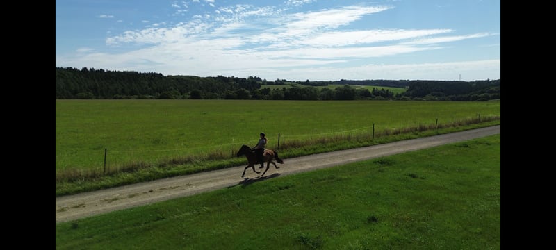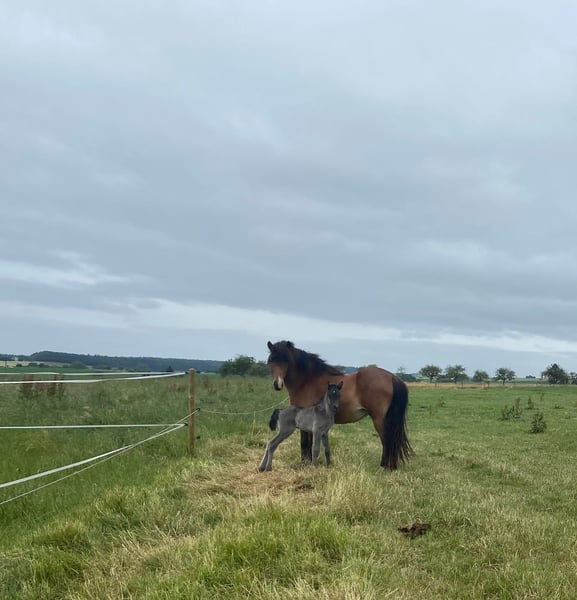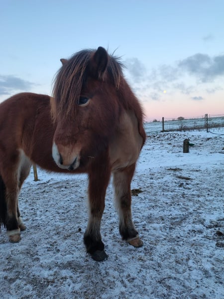 Skráning is a very beautiful 9-year-old five-gaited mare with a star and snip, who provides a lot of riding enjoyment. Her favorite gait is the Tölt, which features expressive movement and is always reliably available in both slow and fast tempos. Last year, she gained her first competition experience, demonstrating potential in Tölt and Pass tests. Her flying pace is currently being further trained, and she has successfully been used as a Pass horse in the IPZV-RA 3. Her temperament is very sweet, with a wonderful presence. Skráning is accustomed to large machinery, cyclists, and has also participated in a few trail rides, where she proved to be a confident and brave riding horse. In 2023, Skráning had a foal, which is developing very well and is also on the farm. She is regularly dewormed, vaccinated, and has been free of eczema since her import in 2021.