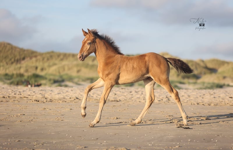 For sale: Beautiful filly Born on 30-05-25 She has a stunning amber champagne color and is expected to grow into a large mare just like her mother. She is being raised alongside her mother in a stable herd of various ages. This provides a nice and social foundation for the future. Pedigree: - Mother: Zep's Pixel van de Woodystables crossbreed Groninger horse x Icelandic – bombproof, strong, friendly, and versatile. Height 1.58 m. - Father: El Perrier van ‘t Pietershof - Perry 43.75% Arabian blood, and on the mother's side comes from a special gaited horse cross (Rocky Mountain x Paso). Height 1.52 m. Recently microchipped and registered with the EASP studbook. Characteristics: Healthy and curious character, very friendly. Beautiful build with strong legs. Unique color for enthusiasts. She is already used to many things such as forest and beach, picking up her feet, grooming, and walks nicely on a lead. Has already been on the trailer a few times with her mother. Possibility to test for DMRT3 (gaited). Location: Schoorl (nh) Price: upon request Feel free to come and meet this special foal. A great opportunity for anyone looking for a striking and sweet companion! Extra option: Currently, she is still staying with her mother, but she can be reserved with a deposit. Please message for more information or to arrange a viewing. Price negotiable, good home important.