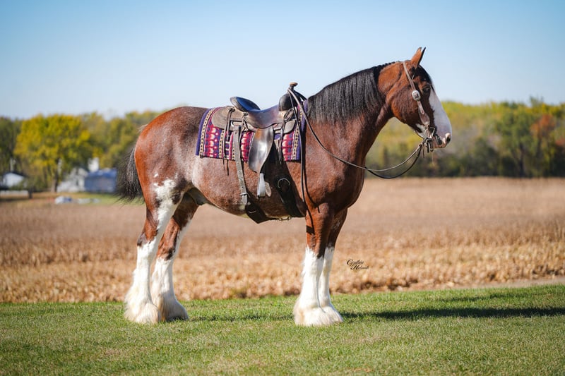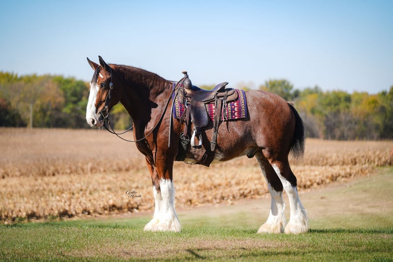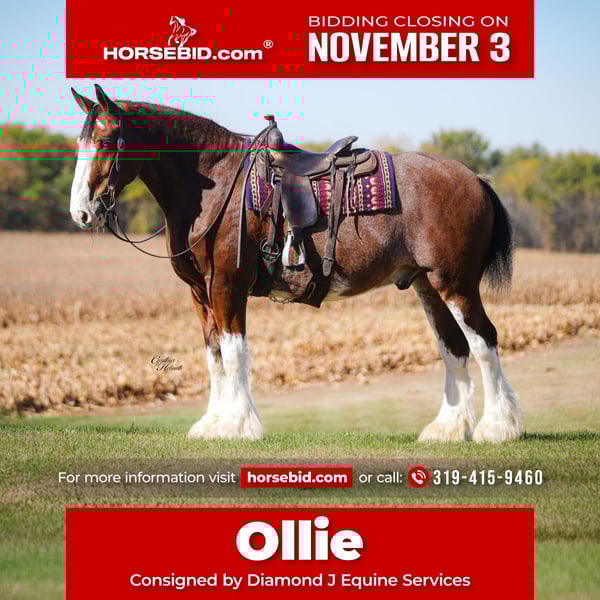 ⚜️𝐓𝐇𝐄 𝐅𝐀𝐋𝐋 𝐇𝐄𝐑𝐈𝐓𝐀𝐆𝐄 𝐂𝐋𝐀𝐒𝐒𝐈𝐂⚜️ Happening now thru MONDAY | NOVEMBER 3rd - Available EXCLUSIVELY on HorseBid's website! For more details and to register visit: www.Horsebid.com CONSIGNOR CONTACT: Diamond J equine service 319-415-9460 LOCATION: Fairbank Iowa BREED: Clydesdale REGISTERED: No REGISTERED NAME: Ollie COLOR: Bay HEIGHT: 17.1 AGE: 9 GENDER: Gelding “Ollie” Is a beautiful 9-yr-old Clydesdale gelding. He stands 17-1 hds tall and is broke to ride and drive single or in a team. With his beautiful color and markings, he is sure to catch your attention wherever you go, whether riding or driving. Ollie has done it all from farming to showing to riding. He has done 4-H shows with young children in the past and is sure to take care of you. He stands well for the farrier, bathes and clips all with ease. Ollie is 100% traffic safe and stands sound. He really is the total package! For more info on Ollie please contact Jonas @ 319-415-9460, we would love to answer any questions you might have!