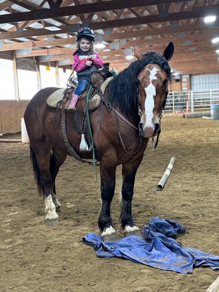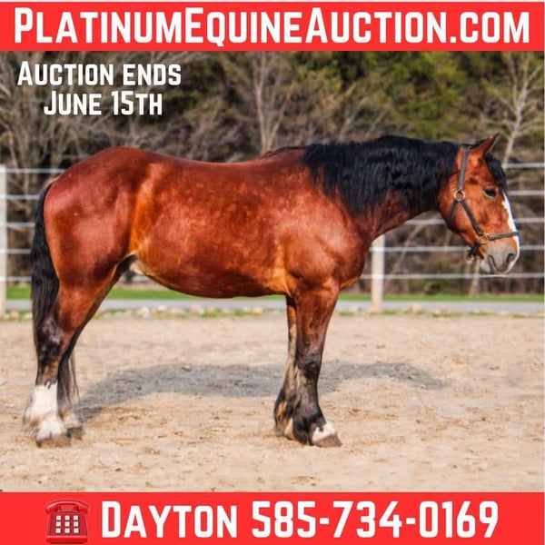 ONLINE AUCTION Place your bids at www.PlatinumEquineAuction.com Starting Bid $3500 Auction ends June 15th, 2025 Need a new saddle? Check out White Rock Saddles on our website or Facebook! Aries is a 4-year-old Clyde cross gelding standing 16.2h tall and weighing roughly 1500 pounds. He has a nice walk, trot, canter, backs, yields his hindquarters, stops off your seat, and side passes. We have used Aries for various events on the farm, such as trail rides, lessons, driving, and our veterans programs; he does it all. Aries has many miles out on the trail and in the arena. He will lope a nice circle in the arena and then ride alone or with a group and cross water, logs, and ditches with no problem. Aries is not only great at riding, but he also drives! He is traffic-safe and comfortable around different types of machinery. Aries’s ability to adapt to various situations and his calm demeanor make him a trusted partner no matter what you want to do. His steady nature and willingness to learn new skills make him a reliable partner for any endeavor. Aries’s versatility and easy-going personality make him a favorite in the barn. We have used Aries as a pony horse for young children on trail rides; even when they feel anxious, he remains composed. Aries loads and unloads with ease and has been hauled to different locations. He behaves like a seasoned horse when stepping off the trailer. Aries is a reliable and well-rounded horse that everyone can enjoy. He stands for the farrier, vet, and clipping. He is UTD on all shots and has a current coggins. Aries sells 100% sound with no vices. PPE is welcomed at potential buyers’ expense. Contact Dayton Wilcott at 585-734-0169 for more information, Aries. Located in Warsaw, NY. ONLINE AUCTION Place your bids at www.PlatinumEquineAuction.com Starting Bid $3500 Auction ends June 15th, 2025 Need a new saddle? Check out White Rock Saddles on our website or Facebook!