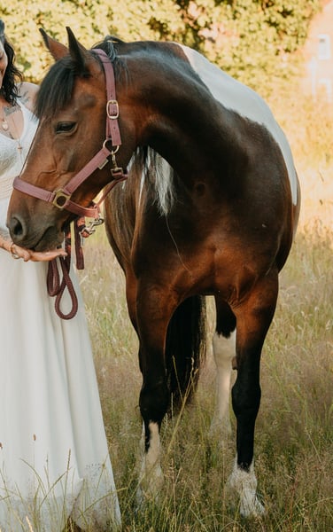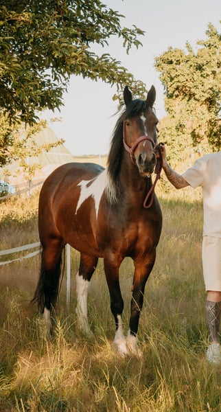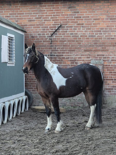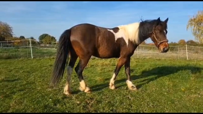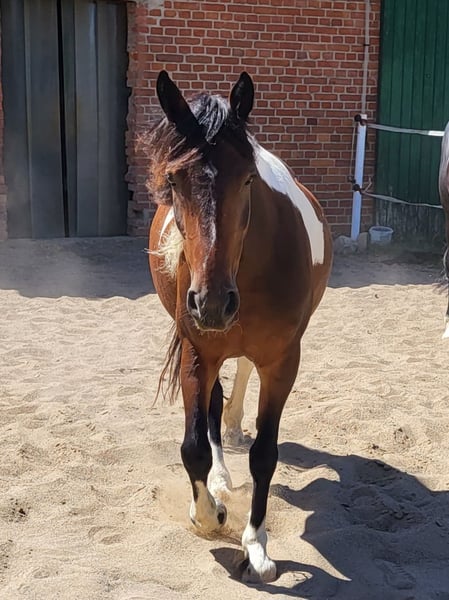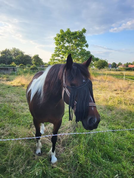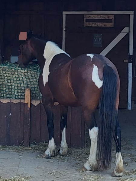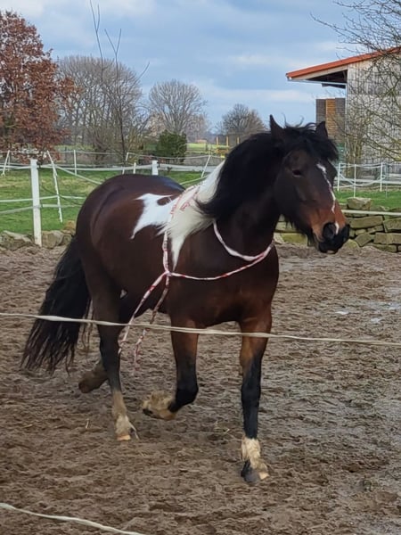Bounty ist ein großartiges Endmaß Pony, voller Leben, Freude und Neugier. Nicht nur wunderschön, dreifarbig, mit zweifarbiger Mähne und kräftigem Körperbau, sondern auch immer zu allen Schandtaten bereit. Quasi ein Pferd zum Pferde stehlen. Ihre Farbe heißt offiziell Skewbald und ihr Equine Pass ist von Leisure Horse Ireland, Irish Plebald & Skewbald Studbook. Bounty ist ein Pferd fürs Leben, mit der man durch dick und dünn kann. Sie ist so wissbegierig, will alles sehen, alles entdecken und ist sehr clever. Ist man da, ist sie es auch, immer anwesend und bereit evtl einen kleinen Trick zu lernen. Sie liebt es Tricks zu lernen, Aufgaben zu kriegen, auf Podeste zu steigen und und und. Aber sie braucht eben auch die Regelmäßigkeit in Beschäftigung, sonst wird ihr schnell langweilig und sie trifft ihre eigenen Entscheidungen. Sie ist super fein in den Signalen, kann aber auch auf stumpf schalten wenn sie einen nicht versteht oder tatsächlich mal nicht verstehen will. Sonst ist sie sehr fokussiert und reagiert auf kleinste Signale. Um so klarer man mit ihr kommuniziert um so feiner und dankbarer ist sie auch. Sie liebt Menschen die ihr klare Grenzen setzen oder sie auch mal in die Schranken weisen. Denen weicht sie nicht von der Seite. Da sie noch keinerlei schlechte Erfahrungen gemacht hat, ist sie sehr aufgeschlossen und nicht ängstlich. Eher Kategorie großer Begleithund als Kategorie Fluchtpferd... Bounty ist super verschmust und voller Liebe. Also wirklich ein von Herzen gutes Tier!!! Sie ist im Ausbildungsstand bei weitem nicht altersgemäß so ausgereift, wie sie könnte, wenn sie in erheblich erfahrenere Hände gekommen wäre. Wir haben uns als absolute Leihen immer bemüht sie vernünftig zu arbeiten, uns aber keinerlei Zeitdruck gemacht. Für uns ist sie einfach ein Teil der Familie und Wegbegleiter und wir haben zu keiner Zeit eine Erwartungshaltung an sie, sondern lieben es einfach aktiv mit ihr Zeit zu verbringen. Nun wandern wir aus und können sie leider nicht mit nehmen... Gekauft haben wir sie mit 5, fast 6 "fast fertig" von einer Stelle, die bekannt dafür ist dass ihre Pferde "fertig" gerade so geradeaus reiten können. Wir haben schnell gemerkt dass sie noch sehr unbalanciert war (ist beim longieren ohne Reiter so schräg gelaufen dass der po weggerutscht ist) und haben mit ihr komplett bei Null vom Boden aus angefangen. Erstmal den eigenen Körper kennen, und die vier Füße sortieren lernen. Leider waren wir zu der Zeit aus reiner Unerfahrenheit noch ziemlich unklar mit der Kommunikation, somit ist Zeit verloren gegangen. Wir haben schon sehr viel mit ihr erarbeitet, aber es ist mit sicherer Führung auch noch einiges weiter zu erarbeiten. AUF ihr habe ich mehr das Problem dass ICH nicht so viel Ahnung von den richtigen Signalen und ganz klar auch unterschätzt habe wie fein sie ist. Leider neige ich noch dazu widersprüchliche Signale zu geben und wenn sie nicht versteht was man will, trifft sie halt eigene Entscheidungen und man wird eher zum Beifahrer... So clever, aufmerksam, anwesend und relativ furchtlos wie Bounty ist, wird sie mit Sicherheit in den richtigen, sie leitenden Händen ein absolutes Verlasspferd in jeder Lebenslage sein! Sie ist kein reiner Rohdiamant mehr, aber ein Diamant der noch sehr sehr viel feiner geschliffen werden kann. Sie hat unendlich viel Potential UND das Herz am richtigen Fleck! Körperlich hatte sie noch nie irgendwas. Ganz im Gegenteil... jeder Osteopath und jeder Tierarzt der sie bisher gesehen hat ist der Meinung, dass sie mit ihrem kurzen, stämmigen, muskulösen Körperbau wohl nie irgendwelche Probleme haben wird! Abgesehen von einer Brust wie ein Pitbull 😄, ist der Rücken eher kurz (weniger Risiko durch zu hängen) und breit wie ein Sofa. Der Zahnarzt war das letzte mal Mitte März 2025 dran, sie ist das letzte mal Jan 2024 gegen Tetanus geimpft (steht hier nur in einem zwei-Pferde-Stall) und der Hufschmied sollte mal wieder drauf schauen (ist Barhufer und kommt damit prima klar!). Durch ihr Bedürfnis für Abwechlungsreichtum und auch ihre Power, können wir uns für Sie keine Boxen Haltung vorstellen. Am schönsten wäre eine kleine Herde mit nettem Auslauf und jemand der sie liebt, so wie sie die Person zurück lieben wird. Mit jemandem, der Lust hat sich immer mal wieder ein bißchen Abwechslung einfallen zu lassen und mit ein wenig mentaler und zeitlicher Investition ein totales Verlasspferd als Wegbegleiter durch dick und dünn wünscht. Ihr komplettes vorhandenes Zubehör wird mit abgegeben. Einschließlich eines neuwertigen Sattels, der aber durch Ihren starken Muskelaufbau definitiv wieder angepasst werden muss (OP 1700,- €). Der ist inkl. qualitativem Bauchgurt, Lammfell Schabracke und high end Sicherheitssteigbügel (OP 250,- €), die den Fuß richtig raus schieben sobald seitlich Druck drauf kommt. Sie hat noch ein Reitpad (OP ca 200,- €) mit einstellbarer Polsterung für einen Wirbelsäulen-Luftkanal. Dazu von Halftern, Stricken, Schabracken, über Doppellonge, Kappzaum und Putzkasten mit Bürsten eigentlich alles vorhanden (außer einem Longiergurt). Sie kann jederzeit, nach Absprache, besichtigt werden.