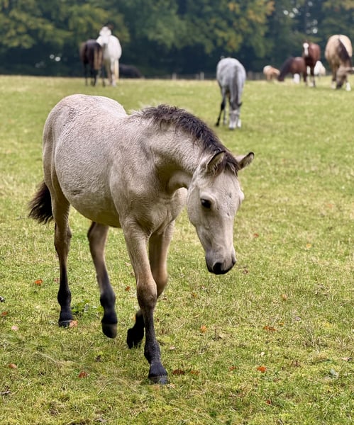 This expressive colt, "Borghorsts Fleetfoot," is looking for a new owner. Fleetfoot was weaned and raised appropriately on pasture within a herd of mares and foals. He is very herd-friendly and enjoys playing with the other foals. He is weaned and currently housed with four companions in a large box with paddock access. He has received a fall deworming treatment and his first vaccination. He is registered with the Schleswig-Holstein Horse Breeding Association as a premium foal, scoring a 9 for his expressive movement and an 8 for type and overall impression. At the Landesfohlenchampionat (Regional Foal Championship) of the Schleswig-Holstein Horse Breeding Association in Bad Segeberg, he was the champion of the Connemara Pony foals. Born on May 10, 2025, dark dun, HWSN/n/n. His dam, My Name is West Indies, is a state premium and performance mare. She passes on her excellent temperament and high rideability to her foals. His sire, Corclough Flazen, is a buckskin-colored, licensed Connemara stallion who has performed beautifully at many shows. Fleetfoot is a promising stallion candidate but will also excel in all disciplines of riding. Our foals are regularly dewormed, introduced to the farrier, and are halter-trained at the time of sale. We invite you to visit our stud to meet Fleetfoot and his friends. Price negotiable.