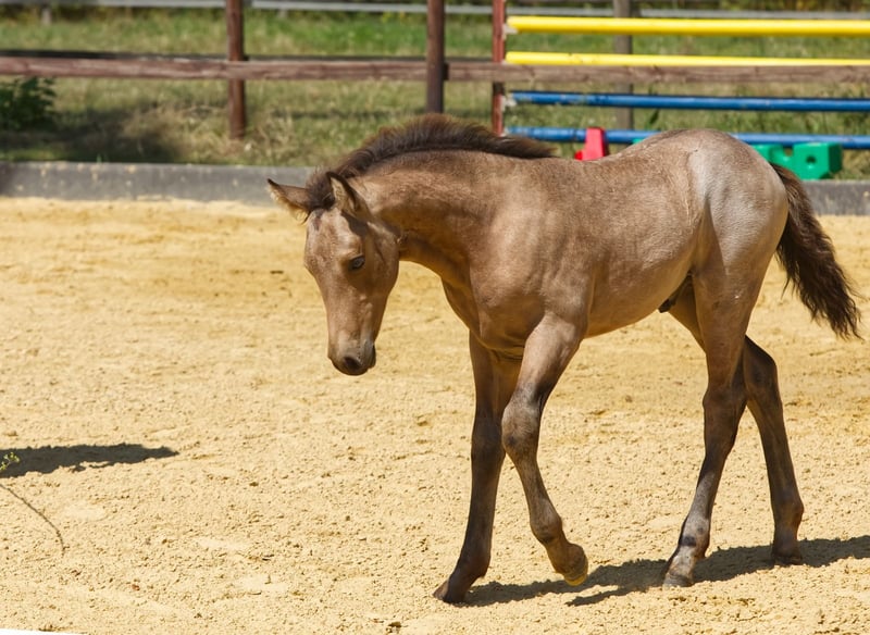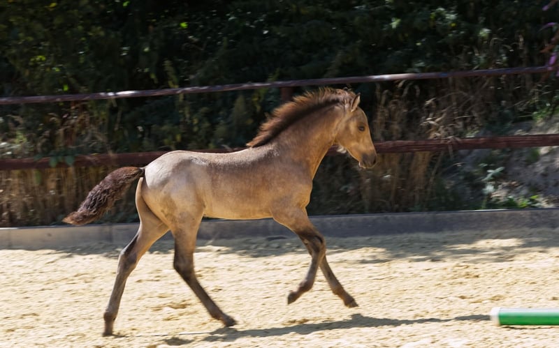 Our spring magic Roheryn was born on May 26, 2025. His mother, Goldie's Sarah, received the association premium from the ZfdP last year. She has expressive gaits and is characterized as an open-minded, curious, and strong-willed pony that is not easily disturbed. His father, RoosenhofsRoyalRock, is still at the beginning of his riding career. He possesses absolute nerve strength and has a good foundation. Additionally, he impresses with his three good basic gaits. Royal is registered in Stallion Book 2 with the ZfdP due to his height of 153 cm. We expect this pairing to produce an all-rounder that can be used in all areas of riding. Roheryn is a very large and strong foal in the desirable color buckskin, possibly even buckskin roan. Since his father is oversized and his mother is at the final height, he will likely reach at least the final height or be slightly taller. Our foals grow up in a species-appropriate manner, in a herd environment, and are mineralized with iWest. His HWSD status is N/N. Both parent animals can be viewed on-site. The last pictures show both parents. If everything fits, the little man can move to his new home after weaning.