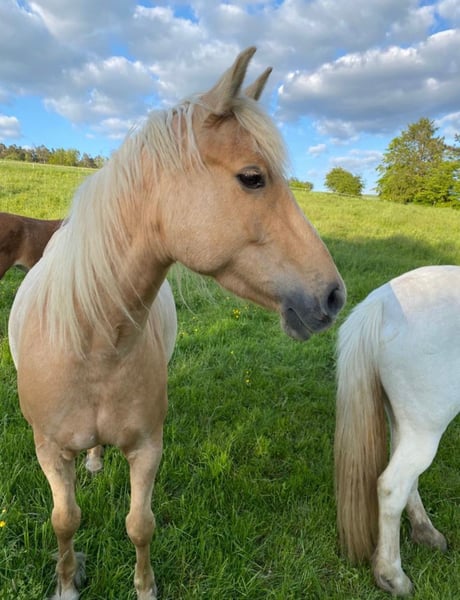 Hermosa y cariñosa y con mucha disposición, esta yegua busca una amazona (o jinete) segura que le brinde confianza y le ofrezca una vida variada. Penny tiene 9 años y fue criada en la estación de descanso de Odenwald. Por ello, su linaje es excepcional: su padre es un mezcla de Trakehner y Pinto, y su madre es una Connemara-Haflinger. Con una altura de aproximadamente 1,55 m, también es adecuada para jinetes de mayor tamaño. Penny es muy sociable, alerta y ágil. Le gusta moverse y, en ocasiones, puede estar un poco nerviosa, pero presenta trotes suaves y bien regulables. La vemos en disciplinas como TREC, Equitación de Trabajo, paseos de larga distancia y, sobre todo, para excelentes excursiones por campo. En doma, sin duda puede progresar, aunque no disfruta mucho del trabajo en la pista. Debido a su temperamento, NO es una yegua adecuada para niños o principiantes. Sin embargo, le encanta que la acaricien manos infantiles. Penny ha pasado toda su vida en un paddock y así quiere seguir. También puede caminar sin herrar sobre caminos asfaltados. Lamentablemente, en los últimos meses, debido a poca actividad ecuestre, ha engordado bastante. Sin embargo, no muestra signos de EMS, ya que come heno a libre disposición y pasta en verano en pastos abundantes. Es posible realizar una prueba de manejo en campo. Venta privada, por lo que no se aceptan devoluciones ni garantías. La creadora del anuncio es mediadora, no la vendedora del caballo, y no recibe ninguna remuneración.