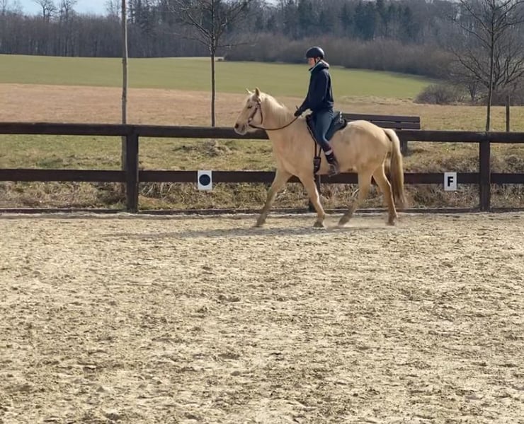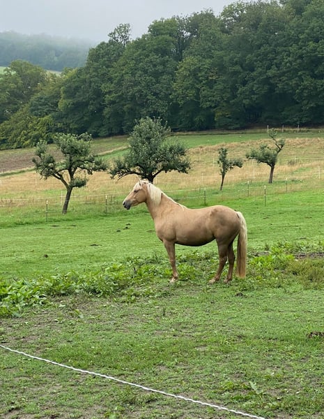 Beautiful, affectionate, and eager to perform mare seeking a confident rider (or equestrian) who can provide her with security and an engaging, varied life. Penny is 9 years old and was bred at the Odenwald Spa Stud. Her exceptional pedigree reflects this: her sire is a Trakehner Pinto cross, and her dam is a Connemara-Haflinger. With a height of 15.5 hh, she comfortably suits taller riders. Penny is very people-oriented, alert, and agile. She is eager to move and occasionally excitable, but she demonstrates smooth, well-regulated gaits. We see her excelling in disciplines such as TREC, Working Equitation, trail riding, and especially for enjoyable hacking adventures. While she could certainly be developed further in dressage, she doesn’t particularly enjoy arena work. Due to her temperament, she is NOT suitable for children or beginners. However, she loves and is accustomed to gentle petting from children. Penny has spent her entire life in an open stable and should continue to do so. She is barefoot and can walk over paved paths comfortably. In recent months, she has become somewhat rounder due to limited riding, but there are no signs of EMS, especially with free-choice hay and lush summer pasture. Trial rides in the terrain are possible. Private sale, therefore no returns or warranty. The seller is an intermediary, not the owner, and receives no compensation.