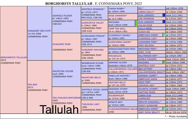 Tallulah is een zeer mooie, niet te grote Connemara merrie. Ze zal een eindhoogte van ongeveer 1,40 meter bereiken. Als veulen is ze gepremieerd. Ze beweegt zich fantastisch. Ze groeit deze zomer op in een kudde en kan tot de herfst hier op het stamboek blijven. Ondanks haar kleine formaat is Tallulah ook interessant voor de fokkerij. Vader Dunlewey Red Kite heeft als jong pony zijn hengstenkeuring in Engeland tegen grote paarden afgelegd. Een altijd vrolijk pony en geweldig om te rijden. (Verkocht naar Zweden) Moeder Tra Ban is rechtstreeks uit Ierland geïmporteerd. Ze heeft bij ons altijd hoog gepremieerde veulens gekregen. Onze pony's zijn allemaal halstergevend en enthousiast voor elke tak van de ruitersport. Hwsd n/n, gevaccineerd en ontwormd. De prijs is bespreekbaar, maar ik wil mijn pony's niet "weggeven"!