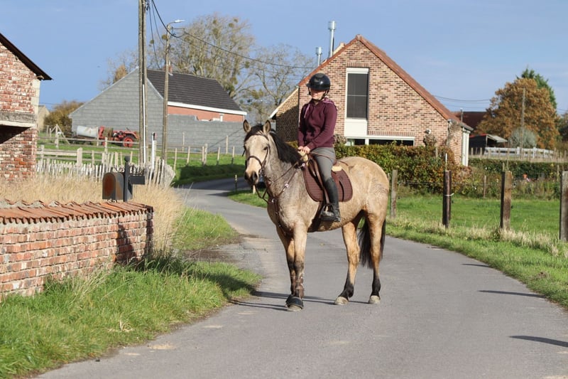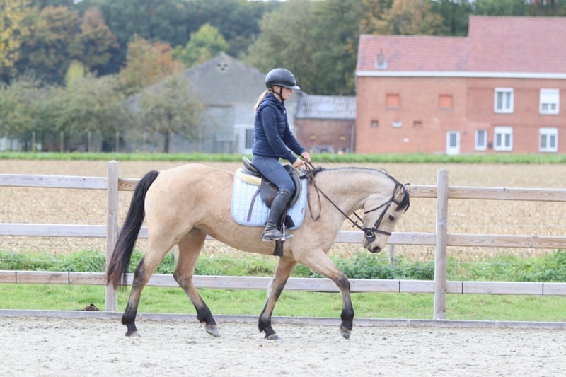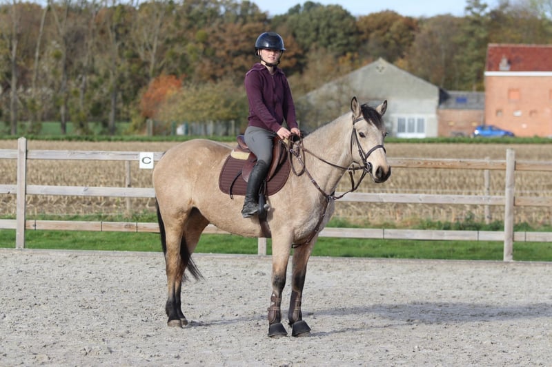 Bohola Beauty (“Bo”) Bo is een 5-jarige valk Connemara-merrie met een stokmaat van 1m53. Ze heeft een aantrekkelijk voorkomen, een zacht karakter en een nieuwsgierige ingesteldheid. Bo springt momenteel een parcourtje van 70 cm en toont duidelijk potentieel voor hoger werk. In de omgang is ze braaf, sociaal en maakt ze snel vriendjes op de weide. Ze geniet ook van wandelen buiten en blijft steeds meewerkend en attent. Bo stamt af van de bekende Connemara-hengst Bohola Mirah, een hengst met een sterke afstamming uit de lijn van Westside Mirah. Bohola Mirah staat bekend om zijn correcte bouw, goede beweging en sterke rasuitdrukking, eigenschappen die ook bij zijn nakomelingen vaak terug te zien zijn. Bo heeft een Class 1-afstamming. Ze is ook N/N getest voor hoofwall, wat extra gemoedsrust biedt over haar gezondheid en erfelijkheid. 📞 Meer info: +32 475 68 22 43 🎥 Voor video’s kan je terecht op onze website.
