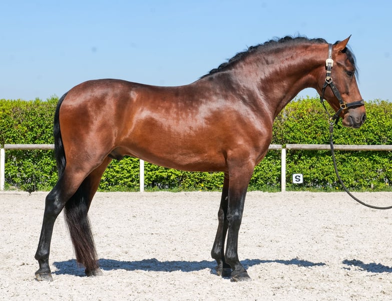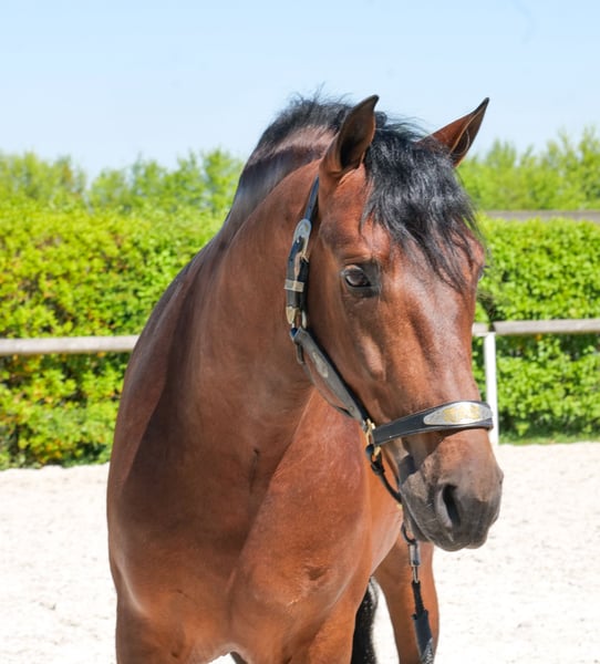 Hermoso caballo, semental, de color castaño, cruzado, similar a un PRE.