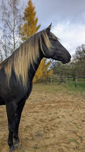 Galaan captivates with his presence and, of course, his striking color. A spirited gelding with a sunny disposition. He learns quickly and enjoys circus tricks and groundwork. In the arena, he moves confidently in all three basic gaits, and his maternal lineage also predisposes him to tölt. Born on June 10, 2016. His sire is a PRE, his dam is a RMH. The pedigrees of both can be seen in the photos. If interested, I can also send more pictures of his dam and sire, as well as photos of Galaan as a foal and young horse. Galaan is an honest horse who can read his rider well. He is very people-oriented once he has bonded, though you need to earn his trust. He can perform Spanish walk, piaffe, lie down, etc., from the ground. He can also fetch. He is highly intelligent and sensitive. Color: windfarben (wind color). Tested negative for PSSM2. Healthy and lively. More of a hippie than a workaholic. With a second horse he trusts, he goes well out on the trail. When alone, he can be cautious and prefers not to go. Walking is no problem. Galaan is a real eye-catcher and a true gem in character. He is part of a gelding herd and is very social and compatible. A special horse for a special rider. !On Instagram under negroplatero, there are more photos and videos of him! Galaan comes directly from his breeder to me and is completely unspoiled in character. He was raised by her, learned the foal basics with love and patience, and was her breeding stallion until she shifted her focus to breeding Arabian Mountains instead of Hispañimountains. Then he came to me. I backed him at age five, not because he was unmanageable, but because I couldn’t provide him with a proper life as a stallion. I am only offering Galaan for sale because he needs a strong rider he can trust. I could tell you a lot about this wonderful horse — it would fill volumes. But if you are the right person for him, I’d be happy to share more. Only WhatsApp! Place before price.