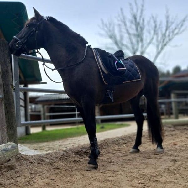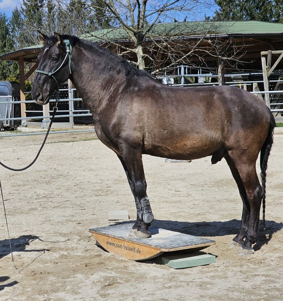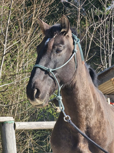 **Sales Listing: Cruzado Gelding, born 2017, dark brown, 15.7 hh** We are offering our Cruzado gelding, born in 2017. With his elegant dark brown coat and a height of 15.7 hands, he enjoys galloping with other geldings across the pasture. The ridden gelding impresses with his agility and liveliness. His training has primarily focused on the principles of horsemanship; he responds to the slightest human movements and strives to perform exercises correctly. He is familiar with ground work and lunging, side reins, double lunge, as well as the mounting block and large wobbly bridge. He is very interested in new objects and shows no fear when exploring them. We are looking for a new owner who wishes to work with him consistently yet kindly. He needs a partner who can provide him with confidence and gradually introduce him to new exercises step by step. Isleno has a mild summer eczema, which can be well managed with proper care. Please feel free to contact me for further information or if you are interested.