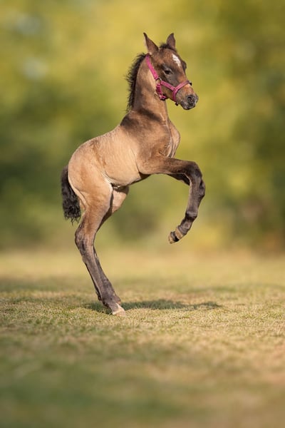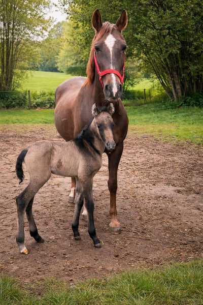 Zum Verkauf steht eine liebe, gesunde Cruzado-Stute (10 Jahre, ca. 155 cm) mit typvollem Buckskin-Stutfohlen bei Fuß. Das Fohlen ist 1 Woche alt, mit schönem Aalstrich und sehr interessanter Farbgenetik durch den Cremello-Vater. Die Stute: 10 Jahre, ca. 1,55 m dunkelfuchs sehr lieb im Umgang, eher zurückhaltend schmiede- und verladefromm gesund sehr guter Trab, elastische Bewegung nicht geritten (nur Zucht/Freizeit möglich) spanischer Pass vorhanden kann wieder vom gleichen Cremello-Hengst gedeckt werden Das Fohlen: Stutfohlen Buckskin mit Aalstrich korrekt gebaut neugierig und menschenbezogen interessante Farbe auch für spätere Zucht Wird nur zusammen abgegeben. Ideales Paket für Zucht, Aufzucht.