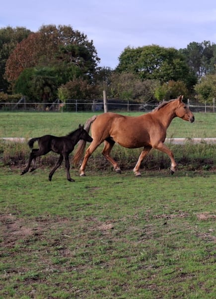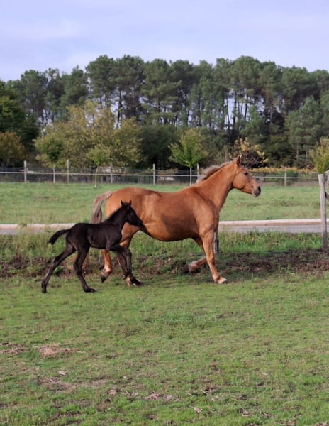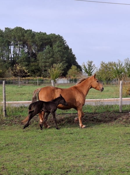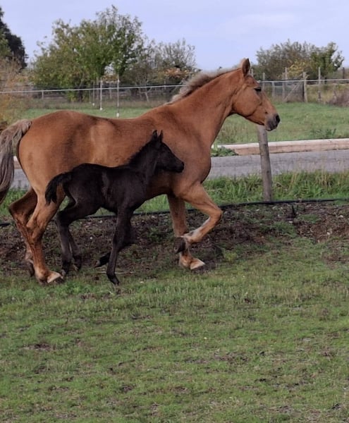 Te koop: merrie met een fantastisch karakter, gereden met haute école-oefeningen, met een pasgeboren veulen. Zeer bijzondere aftekeningen. Foto van de vader: een puur Spaanse rijpaard met een zwarte vacht.