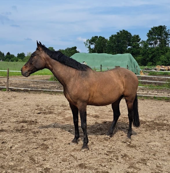 Lovely 15-year-old Cruzado mare, standing at 1.52 m, available for a limited time as a semi-ridden horse. Most recently ridden by a 17-year-old girl. She requires an experienced rider who can provide confidence and security. Trail riding alone or in a group, as well as small jumps, are no problem for her. Very well-behaved and uncomplicated in handling. Familiar with farm machinery, children, dogs, and other everyday situations. In summer 2023, she suffered a mild tendon inflammation, which has now fully healed. However, due to lack of time and interest, she was not retrained for riding. Therefore, she is currently offered as a semi-ridden companion horse.