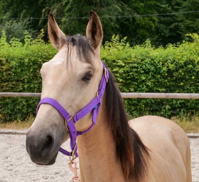 Bonita is this 1-year-old, beautiful and people-oriented Andalusian mare with an indescribably sweet character. When leading, grooming, lunging, and exercising, she is attentive and incredibly kind. During trail walks or as a companion horse, we experience her as fearless and absolutely well-behaved. She learns very quickly, has three good basic gaits, and wants to please her human in every situation. Bonita lives in a mixed herd in an open stable with pasture and is very compatible with other horses and ponies. These are not guaranteed traits but merely subjective impressions of the seller. The stated sale price is the gross price. We would be happy to send you more pictures and riding videos. Please send us a WhatsApp message at 0178 9394010. Like all our horses, she enjoys age-appropriate, gentle, and above all, varied training. Of course, daily turnout in the paddock or pasture is essential. Our horses are regularly presented to the farrier; currently, she is barefoot. She has been freshly dewormed and is vaccinated. A clinical or radiological pre-purchase examination can be conducted by your veterinarian or ours. For a fee, we will gladly deliver your dream horse to its new home. Have we piqued your interest? Please send a WhatsApp message to our office at +49 178 9394010 (WhatsApp only). For a personal conversation, please call: +49 1511 9487595 (calls only). We look forward to hearing from you! Currently, we are offering more sale horses; you will find your dream horse with us! Feel free to visit our homepage at: www.marvinsroyalhorses.de. Dear customer, we would be happy to introduce you to our horses, and trial rides in the arena, on the outdoor arena, or in the field, as well as lunging and groundwork, are possible for you to get to know your dream horse better. This costs €40 for one horse, €30 for each additional one, and will be refunded upon purchase. Location Germany Neustadt (Wied) 53577