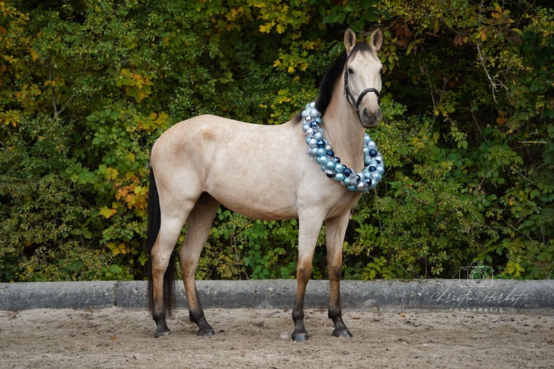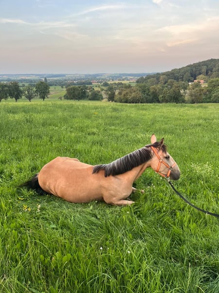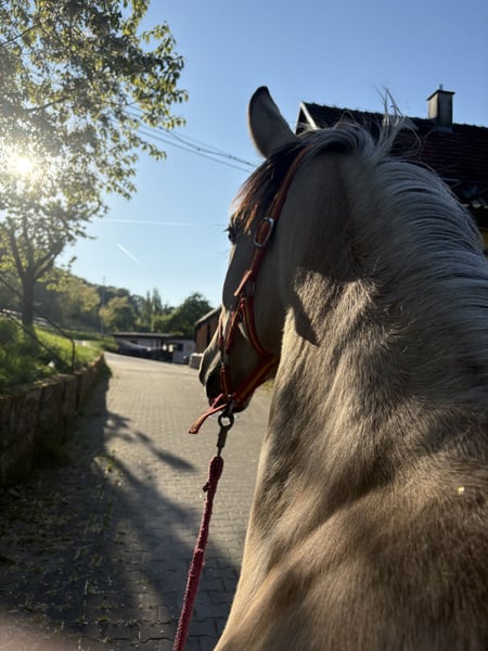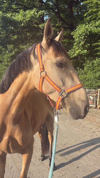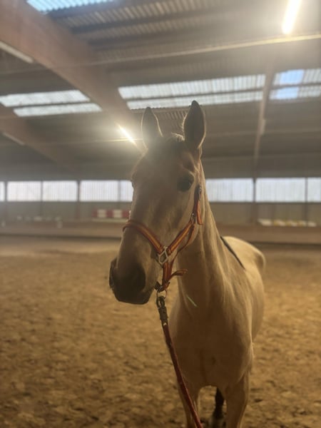Hiermit suche ich ein neues Zuhause für Carpetana, eine hübsche Falbstute, geboren 2021, circa 1,50m groß. Capri wurde Anfang dieses Jahres aus Spanien importiert und kam vom Händler direkt roh zu uns. Gemeinsam haben wir mit ihr Bodenarbeit gemacht, sie angeritten und alle wichtigen ersten Schritte erarbeitet. Von Anfang an war sie dem Menschen sehr zugewandt, super brav und hat keinen falschen Schritt beim anreiten gemacht. Kennt kein Bocken oder Steigen. Die Überlegung war sie hier im Schulbetrieb einzusetzen, dafür ist sie meiner Meinung nach aber zu fein und hat doch vielleicht Potenzial für mehr. Nach einem halben Jahr kennt sie nun alle Grundgangarten unter dem Reiter, Stangenarbeit und sogar Ausritte in der Gruppe. Spazieren geht sie auch alleine und kleine Sprünge ohne Reiter haben wir ebenfalls mit ihr gemacht. Update: Heute hat sie das erste Mal Cavalettis mit Reiter gemacht und hatte sehr viel Spaß und einen angenehmen Zug zum Sprung! Kleine Sprünge macht sie inzwischen mit viel Freude. Sie hat ein gutes Go und freut sich über tägliche Arbeit. Je mehr man mit ihr macht, desto besser wird sie! Sie ist schmiedefromm und brav beim Tierarzt. Natürlich darf man nicht vergessen, dass sie erst 4 ist und damit nicht für Anfänger geeignet. Ein Reitvideo gibt es auf Anfrage. Für ein Probereiten nehme ich für den zeitlichen Aufwand 25€.