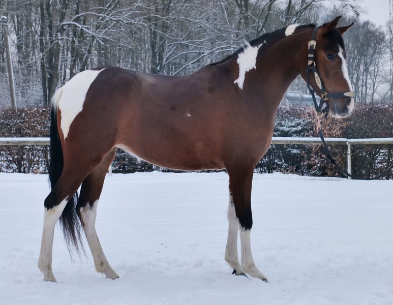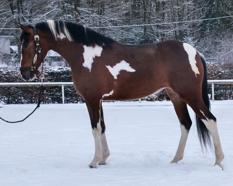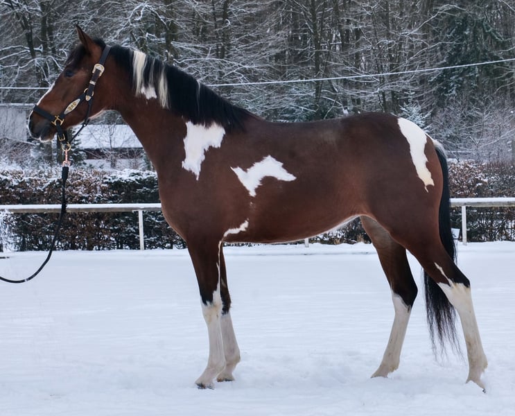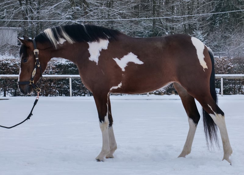 Name: Pintora Breed: Crossbreed Gender: Mare Date of Birth: September 27, 2022 Age: 3 years Height: 15.3 hh Color: Pinto Pedigree: No pedigree available Temperament: Friendly and affectionate with people, eager to learn, brave, calm, curious, intelligent Training/Suitability: Lunged, suitable for leisure riding, dressage, working equitation Trail Experience: Attentive, resilient, fearless, comfortable in a group Health: Dewormed, vaccinated, barefoot, eczema-free, teeth checked, osteopathically treated Stabling: Box stall, open stable Special Features: Farrier and loading confident, herd-friendly Please note that the qualities listed are based on our personal assessment and do not constitute guaranteed traits. Price: €7,900 (gross) Has Pintora caught your interest? To give you a better impression of Pintora, we are happy to send you her riding video. Of course, we are available for a detailed description of the horse, personal consultation, and to answer all your questions by phone. Feel free to contact us anytime via WhatsApp or call us at: +49 151 19487595 Our phone hours are daily from 7:00 AM to 1:30 PM and after 8:00 PM. We look forward to hearing from you! A clinical or radiological pre-purchase examination can be performed by your veterinarian of choice. Pintora can be safely and comfortably delivered to your new home. We handle all necessary preparations and transportation to ensure your new horse arrives stress-free, well-cared-for, insured, and in good health. Currently, we offer a carefully selected range of horses for sale. With us, you are sure to find your dream horse. Visit our website at: www.marvinsroyalhorses.de Dear customers, we are happy to introduce you to our horses and offer grooming, tacking, lunging, ground work, and trial riding sessions in the riding hall, on the arena, or in the field to help you get to know your new family member better. These sessions cost €40 for one horse and €30 for each additional horse and are refunded upon purchase. Our address: Ferdinand Grube 50 53577 Neustadt-Wied Google Maps: marvinsroyalhorses