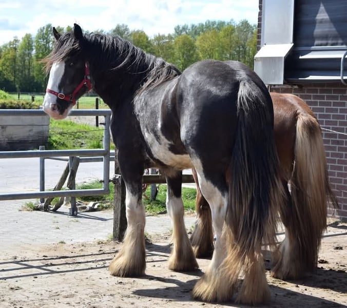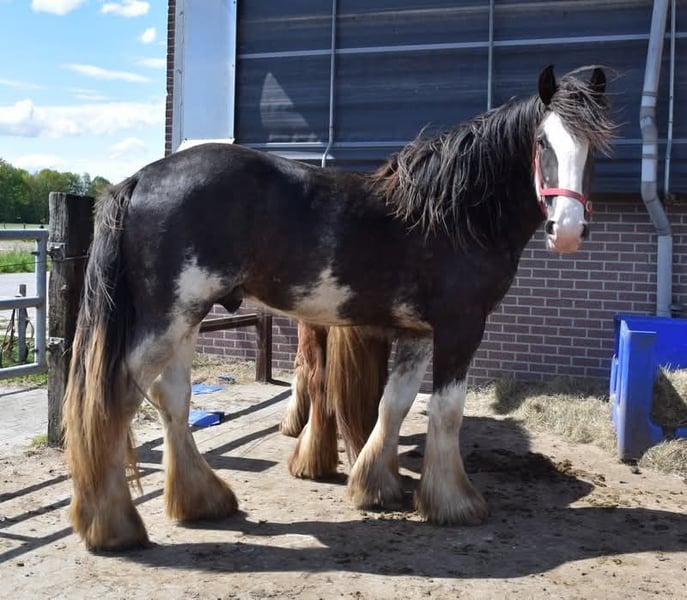 White Knight is a stunning colt. He is expected to grow to a height of approximately 1.60/1.65 meters. Mother is a Tinker mare. Father is a Clydesdale stallion, Stobilee Proclamer. He received his first premium and was awarded day champion at the NSvT inspection.