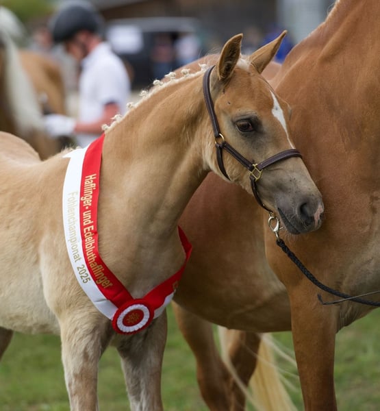 ✨ Never Stop SCH – Premium Edelbluthaflinger Colt with Champion Lineage & Exceptional Pedigree ✨ Born in 2025, Never Stop SCH impresses across the board: correct conformation, athletic type, expressive movement – and a pedigree that leaves no wishes unfulfilled. 🏅 Reserve Champion at the Franconian Foal Championship 2025 – his quality has already been officially recognized. 🧬 Top-Class Lineage Sire: Narcotic v. DSP E/BP Nakuri * Reserve Champion of the South German Edelbluthaflinger Licensing Modern, athletic, and expressive – a promising stallion with strong inheritance potential. Grandfather: BP/E/L/P DSP Nakuri A true flagship of Edelbluthaflinger breeding: * Winner stallion of the South German licensing * Performance test winner * Federal Champion in Driving & Reserve Federal Champion in Breeding * World Champion in Single Harness Dressage, multiple German & Bavarian driving champions * Champion of the 4- and 5-year-old German driving ponies * Numerous licensed sons and state premium mares, including top stallions and state winners * Recognized as the world’s best dressage Haflinger in driving 🌟 Dam: E/SP My Money SCH An outstanding elite and state premium mare with extensive performance and breeding record. Performance highlights (including): * Premium gold foal, Future Prize Champion mare, overall winner at the Verband mare show * Best registered mare in Franconia (2010) * State premium, finalist at the Landes mare show, participant in the Federal mare show * Winner of the mare performance test (dressage) * Overall reserve champion mare EH (2016) * Elite mare since 2022 Progeny: * Successful in competitive sport (dressage, eventing, Western) * Multiple winners and reserve winners at regional foal championships * Several winners and reserve winners at mare performance tests – their offspring stand for performance, character, and quality 🐴 Reliable handling – well-socialized from an early age Never Stop SCH was raised appropriately, regularly dewormed, halter-trained, and is shoe- and load-safe. He is very people-oriented, curious, and balanced in daily handling – ideal conditions for a smooth further development. 🐴 Never Stop SCH – Your Stallion Prospect with a Future A foal straight out of a picture book – with exceptional genetics, a promising presence, and a character that convinces. Perfect for breeding, sport, or demanding leisure riding.