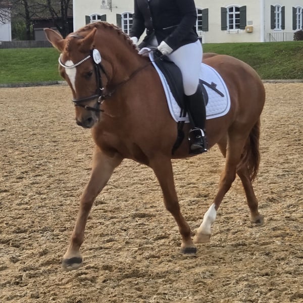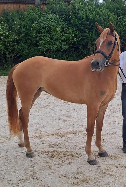 We are offering our elite Trakehner mare "Klarissa" for sale. She is sired by the renowned stallion Exquiso. Her Arabian blood percentage is 30.5%. Born on May 9, 2021, she is currently foal at foot but will be weaned soon. Klarissa is pregnant by the stallion Aquagon; however, we would consider taking the foal back in autumn 2026. She successfully completed her FLP on October 29, 2025. If you are genuinely interested, please feel free to contact us. We look forward to your inquiry. Regina and Michael Lang