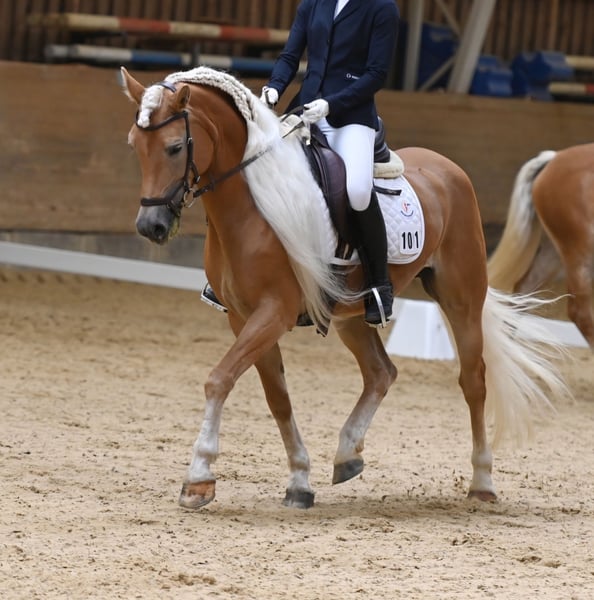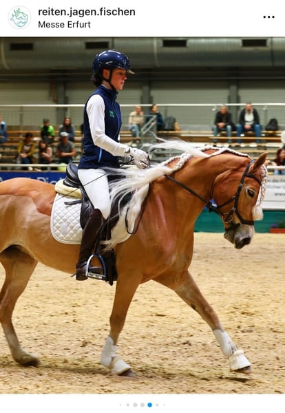 Zum Verkauf steht die außergewöhnliche Edelbluthaflinger Stute „Bandura“, 8 Jahre alt – ein Pferd, das in der Kombination aus Sporterfolg, Charakter, Optik und Zuchtqualität nur äußerst selten zu finden ist. Mit einem Stockmaß von 1,53 m bringt sie die ideale Größe mit, um auch größere Reiter sehr gut abzudecken, bleibt dabei aber absolut unkompliziert und auch von Kindern sicher zu händeln. Ihr ausgeglichener, freundlicher Charakter sowie ihre Menschenbezogenheit machen sie im täglichen Umgang zu einem echten Verlasspferd. Optisch begeistert sie mit ihrer extrem langen, dichten Mähne und ihrem typvollen, ausdrucksstarken Erscheinungsbild. Bandura ist kerngesund, war noch nie krank, regelmäßig geimpft und ostheopathisch behandelt. Sie zeigt sich in allen Bereichen absolut zuverlässig. Sie ist selbstverständlich verlade- und schmiedefromm und überzeugt durch ihre ruhige, kooperative Art – sowohl im täglichen Training als auch im Umgang. Sie konnte auf Turnieren zahlreiche A- und Dressurpferde L Platzierungen erzielen, darunter mehrfach Siege mit konstanten 8er-Noten, was ihre Qualität und Rittigkeit eindrucksvoll unterstreicht. Besonders hervorzuheben sind ihre zwei Siege in den Nürnberger Burkpokal Qualifikationen 2025 für die Thüringer Junioren. Zudem wurde sie auf mehreren Veranstaltungen vorgestellt, wie zum Beispiel die Messe Reiten Jagen Fischen, auch da zeigte die sich immer ruhig und händelbar. Auch im Springen zeigt Bandura viel Vermögen und Übersicht und absolviert einen A*/ A**-Parcour souverän und sicher. Im Gelände präsentiert sie sich absolut geländesicher, nervenstark und motiviert, wobei sie insbesondere an Geländesprüngen große Freude hat. Damit ist sie ein vielseitig einsetzbarer Allrounder für ambitionierte Reiter, die gerne auf Turnieren starten wollen. Züchterisch ist sie ebenfalls hochinteressant: Als Staatsprämienstute und Teilnehmerin der Elitestutenschau bringt sie beste Voraussetzungen in Abstammung, Exterieur und Bewegung mit. Zudem hat sie bereits ein Fohlen zur Welt gebracht, wodurch sie ihre Zuchtqualität auch praktisch unter Beweis gestellt hat und sich sowohl für den weiteren Sporteinsatz als auch für die Zucht gleichermaßen empfiehlt. Unter dem Reiter zeigt sie sich jederzeit leistungsbereit, ehrlich und angenehm zu sitzen.Sie zeigt lediglich eine bekannte, leichte Eigenheit, bei der sie gelegentlich die Zunge einrollt oder kurz herausstreckt, sie jedoch in keiner Weise in Rittigkeit, Anlehnung oder Leistungsfähigkeit beeinflusst – was sich auch deutlich in ihren sportlichen Erfolgen widerspiegelt. Der Verkauf erfolgt ausschließlich aus persönlichen Gründen, da ich ab diesem Sommer ein Studium beginne und dadurch nicht mehr ausreichend Zeit für zwei Pferde aufbringen kann, um diese optimal zu fördern. Die Abgabe fällt entsprechend schwer, daher wird Bandura nur in beste und fördernde Hände abgegeben. Weitere Videos oder Infos über WhatsApp 01738006772