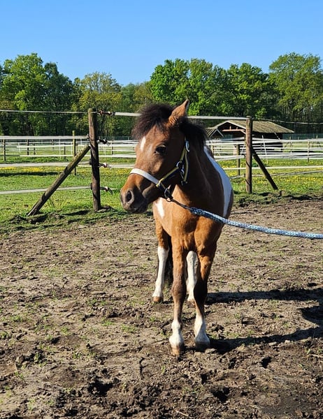 Aufgrund der Verkleinerung unserer Zucht aufgrund von Gesundheitsproblemen bieten wir einige unserer reinrassigen Falabella-Pferde zum Verkauf an. Foto 1 & 2: Hooidonkhofs F. Antonio (Hengst) – geboren am 17. Mai 2024 – Farbe: schwarzes Appaloosa – Antonio belegte bei der Falabella-Zuchtprüfung des European Falabella Studbook im August 2025 mit 82 Punkten den ersten Platz bei den Junghengsten (erste Prämie / Gold). Er fiel durch sein schönes Aussehen, seine hervorragenden Gänge und seine geringe Größe besonders auf. Foto 3, 4 & 5: Hooidonkhofs F. Téa Serafina (Stute) – geboren am 16. April 2023 – Farbe: Braun-Pinto – Serafina erhielt bei der Falabella-Körung des European Falabella Studbook im August 2023 als Fohlen eine erste Prämie / Gold. Beide Pferde sind mit ihren Impfungen auf dem neuesten Stand. Sie werden regelmäßig beschlagen und täglich von Hand geführt. Sie sind beim European Falabella Studbook registriert.