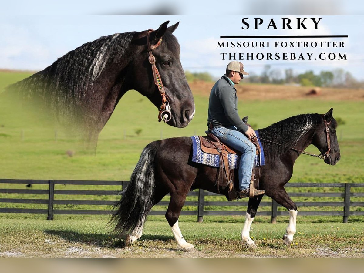 OPEN BIDDING ON THEHORSEBAY,COM. SALE ENDS ON 04/30. More information is available on the website, including an UTD vet inspection, Coggins, video, images, and the owner's contact information to ask questions, request information, or make arrangements to come to visit. I am proud to introduce you to Sparky! Sparky is a breathtaking 11-year-old black tobiano Missouri Foxtrotting gelding with more chrome than a ’57 Chevrolet! Sparky has been a barn favorite around the farm since the kids first met him! He stands 14.2 hands tall and is built like a German tank! Sparky has been with us for around a year now, and he has been a ball of fun to have around! Always being the go-to horse for beginners or advanced riders! He has that perfect foxtrotting gait that is highly sought after. He stays smooth and comfortable no matter how long you ride. Sparky loves trail riding and knows the Daniel Boone National Forest like no other! He never gets in a hurry when trail riding; he takes his time, watches where he’s going, and carefully maneuvers up and down the rough terrain. He crosses creeks, logs, and ditches with ease. Sparky is traffic safe. The big rigs and small cars do not phase him whatsoever. He stands to tack, mount, dismount, bathe, and shoe like a gentleman. If you’re in the market for a dependable, laid-back trail partner, look no more. Big or small, little or tall, Sparky is sure to suit them all!