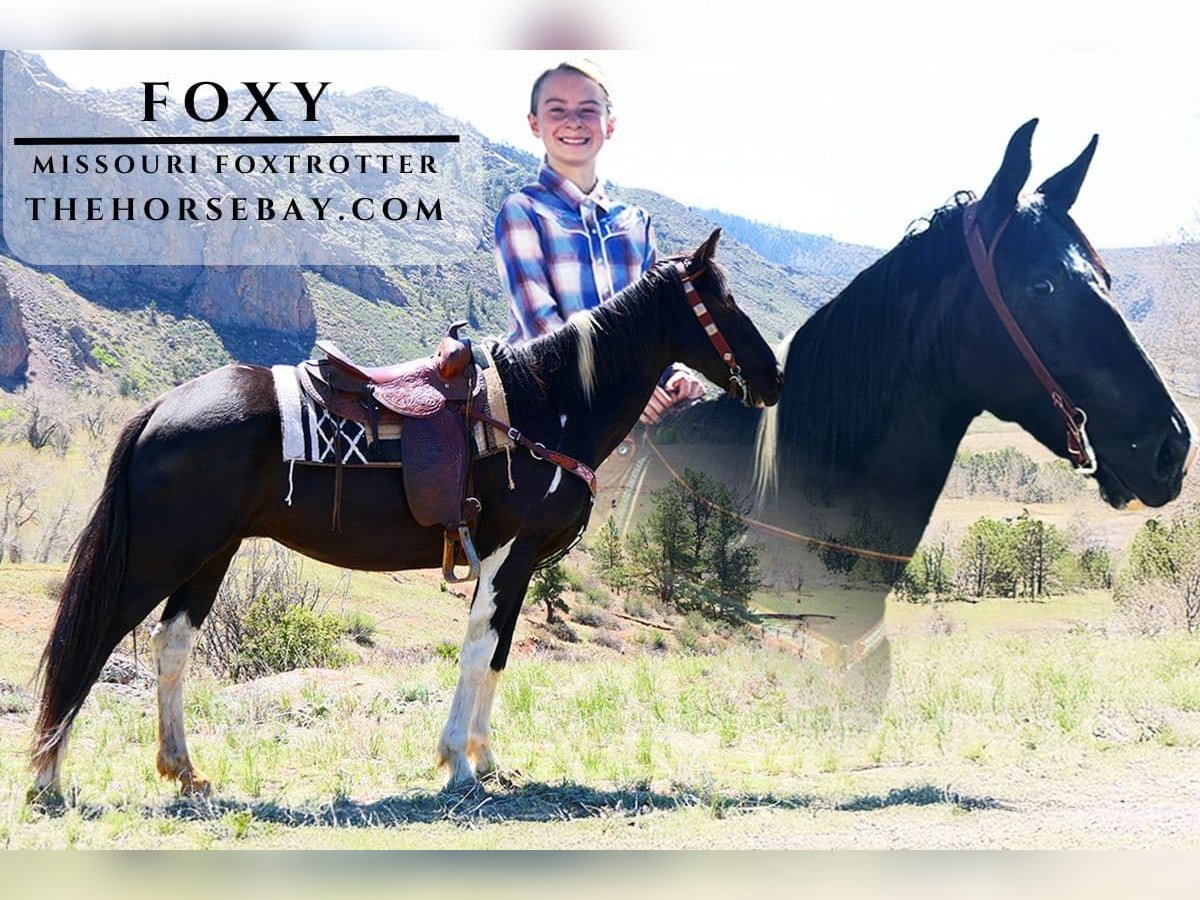 Meet Foxy, a beautiful 12-year-old Missouri Fox Trotter mare standing 15.2 hands tall. This striking black and white paint is as eye-catching as she is dependable. Foxy is the sweetest girl with a huge heart—she’ll do absolutely anything you ask. She is well-trained, incredibly gentle, and both husband- and kid-safe. She’s done it all—from pushing cows on the ranch to mounted shooting. Foxy is always our first pick to hit the trails—she’s the kind of horse you can swing a leg over without a second thought. This mare has no quit in her, and she’ll go all day with a great attitude. She’s also the most sure-footed horse we’ve ever ridden—confident and careful in any terrain, making her perfect for mountain rides, rough ground, or beginners learning the ropes.