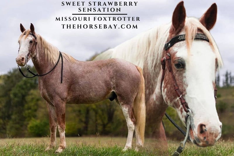 Strawberry is a 6-year-old, DNA-d, registered Missouri Foxtrotting gelding. Strawberry was born, raised, and started right here on our farm in Marshfield, Missouri. He is a grandson of Southern Sunrise and a son of Southern Sunrise’s Hotshot (see photo). I was right there when he was born in my back pasture. Strawberry was first ridden by me at 79 years old. Knowing his calm disposition since he was born, and knowing his sire, grandsire, dam, etc. , I was pretty certain it was safe getting on him for his first ride. When you’re nearly 83 years old, you don’t stand up on a horse unless you trust him! While on the trail, you can drop the reins on Strawberry, and he will hold a nice, slow, steady walk in which you can ride with non-gaited horses. He will also consistently walk faster if you cue him to do so (just by squeezing your legs). He has a nice, even foxtrot and a lope (canter) that is a dream to ride! Strawberry also has a nice, fast rack that I prefer. Strawberry is easy to mount and dismount, standing perfectly still, patiently waiting for your cue to move forward or back. He loads quickly and easily in any horse trailer and backs out when asked. He loves his bath. He is very easy to catch! He loves babies, dogs, cats, and people, just to name a few! (Oh! And apples and other horse friends! He has always been with other horses and gets along with them well. Strawberry will be an eye-catcher on the trail with his beautiful color and conformation, his gentle, friendly demeanor, and just his all-around appearance! We strongly encourage people to call and come ride Strawberry while he is listed on visit our website We look forward to meeting you and answering any questions you may have about Strawberry.